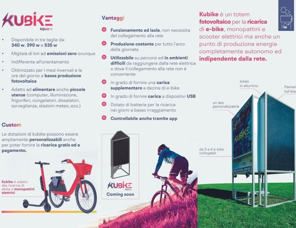 La colonnina è un poliedro per la ricarica delle e-Bike , dei monopattini e degli scooter elettrici . ma è anche un punto di produzione di energia elettrica , interamente dal sole , e completamente autonomo ed indipendente dalla rete. Ti presentiamo Kubike!