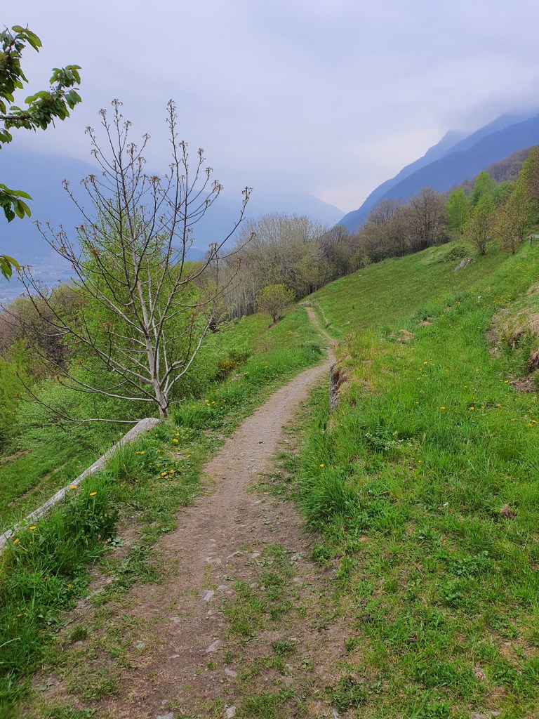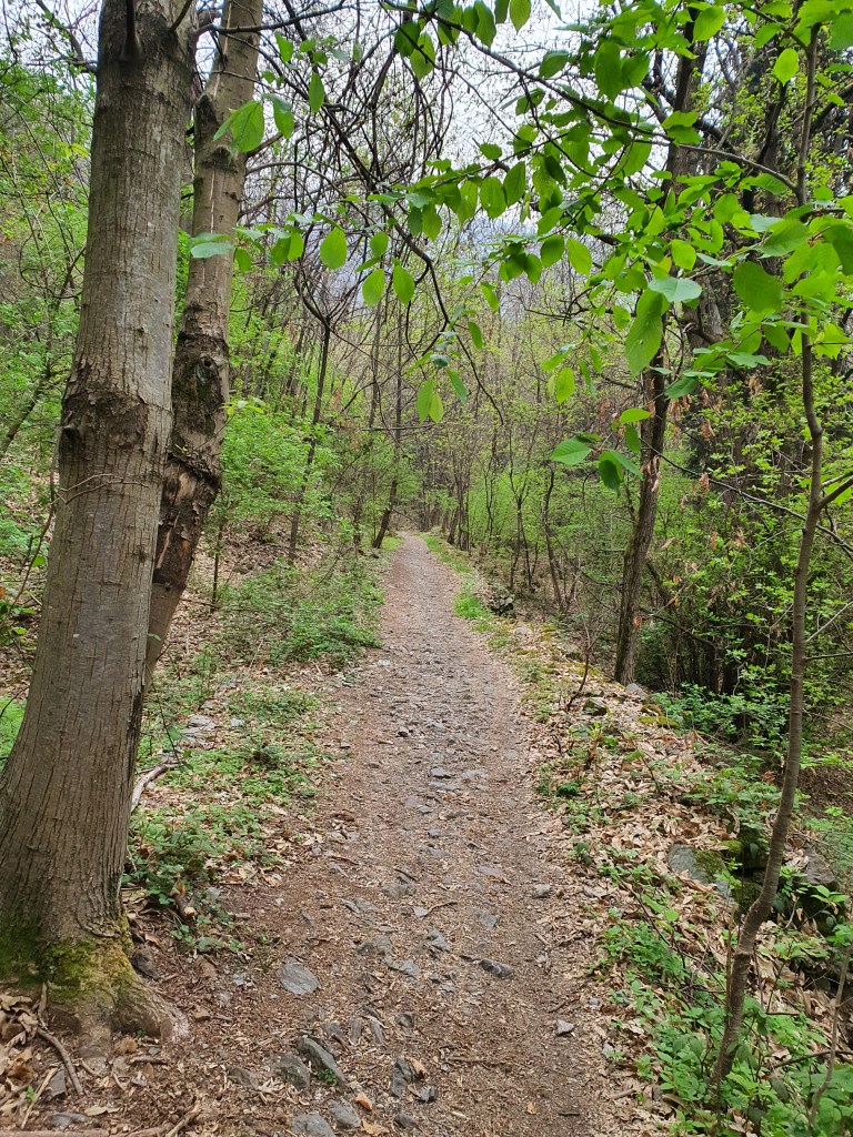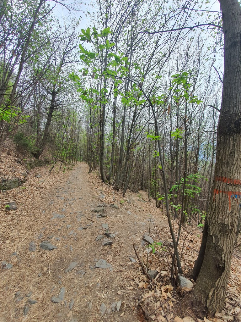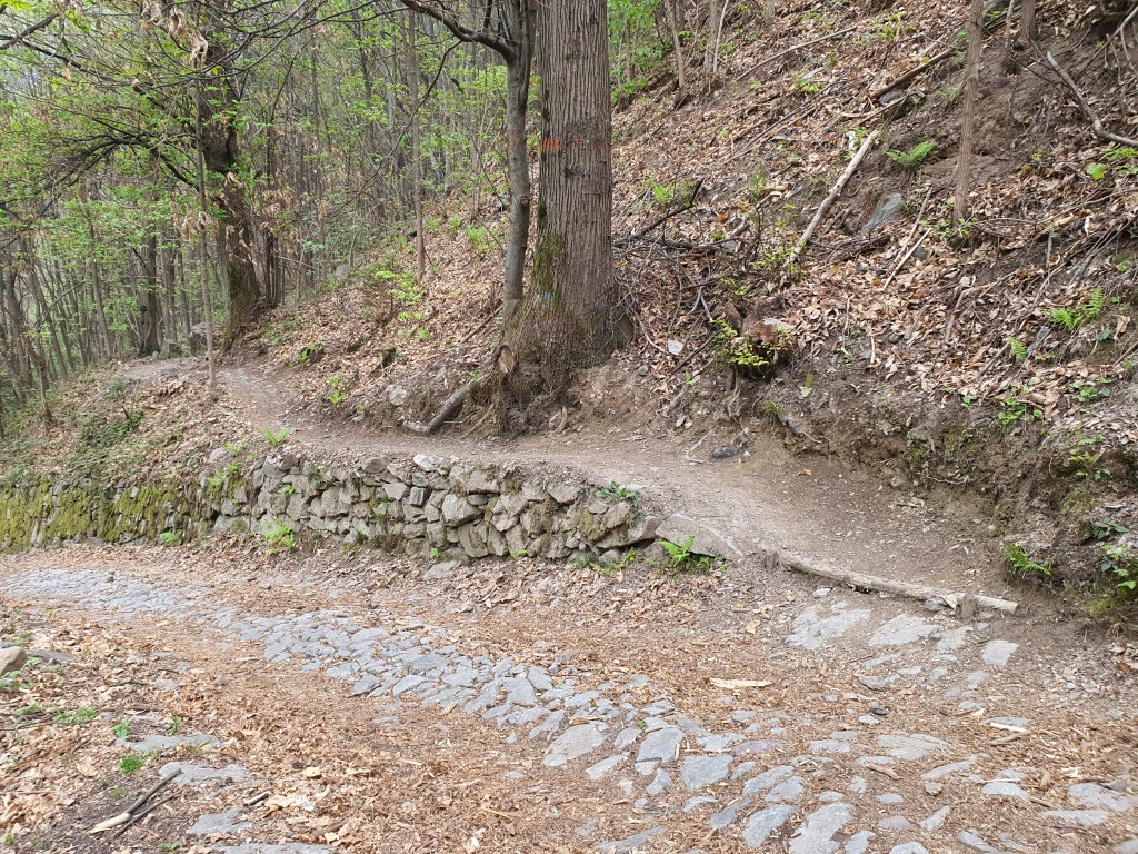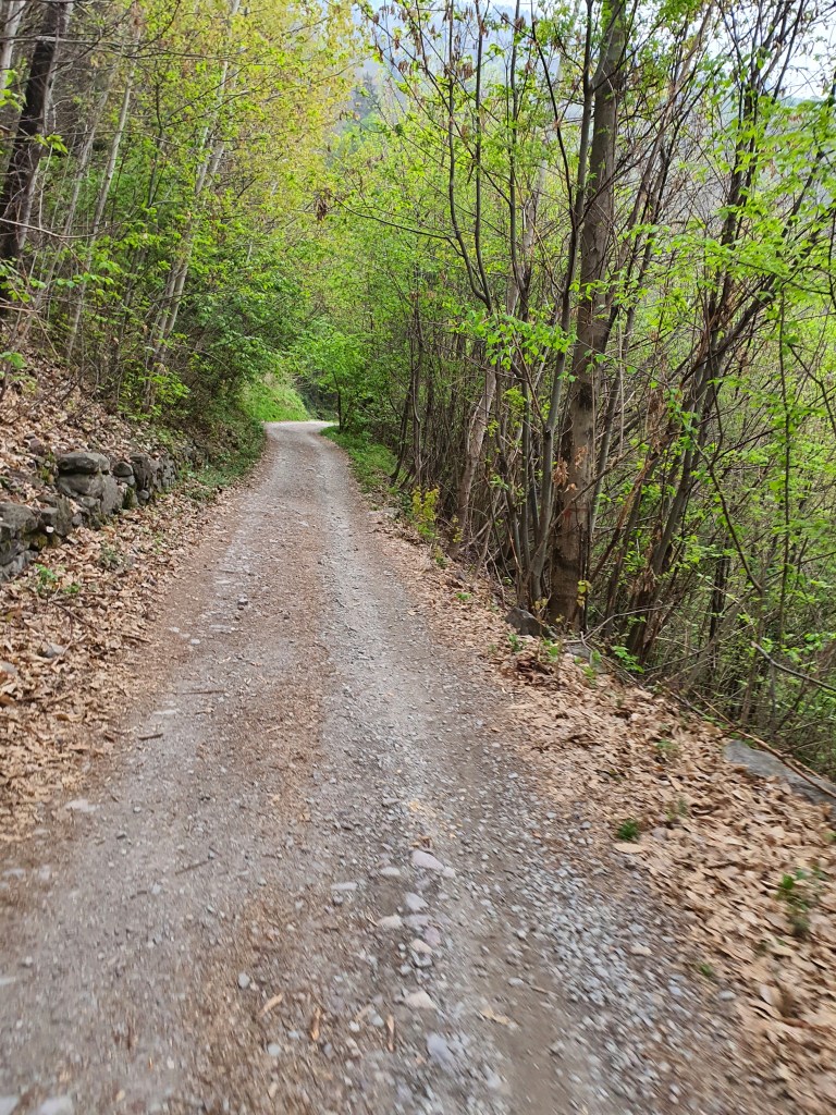 Continuiamo quindi lungo il rettilineo . Ad un certo punto incontreremo altre 2 biforcazioni , a sinistra andremo sempre a piazze ma lungo una mulattiera molto disconnessa (•24) , mentre a destra scenderemo tra artogne e giancio . A questo punto dovremo salire la curva più ripida di tutto il trail (•25) .
