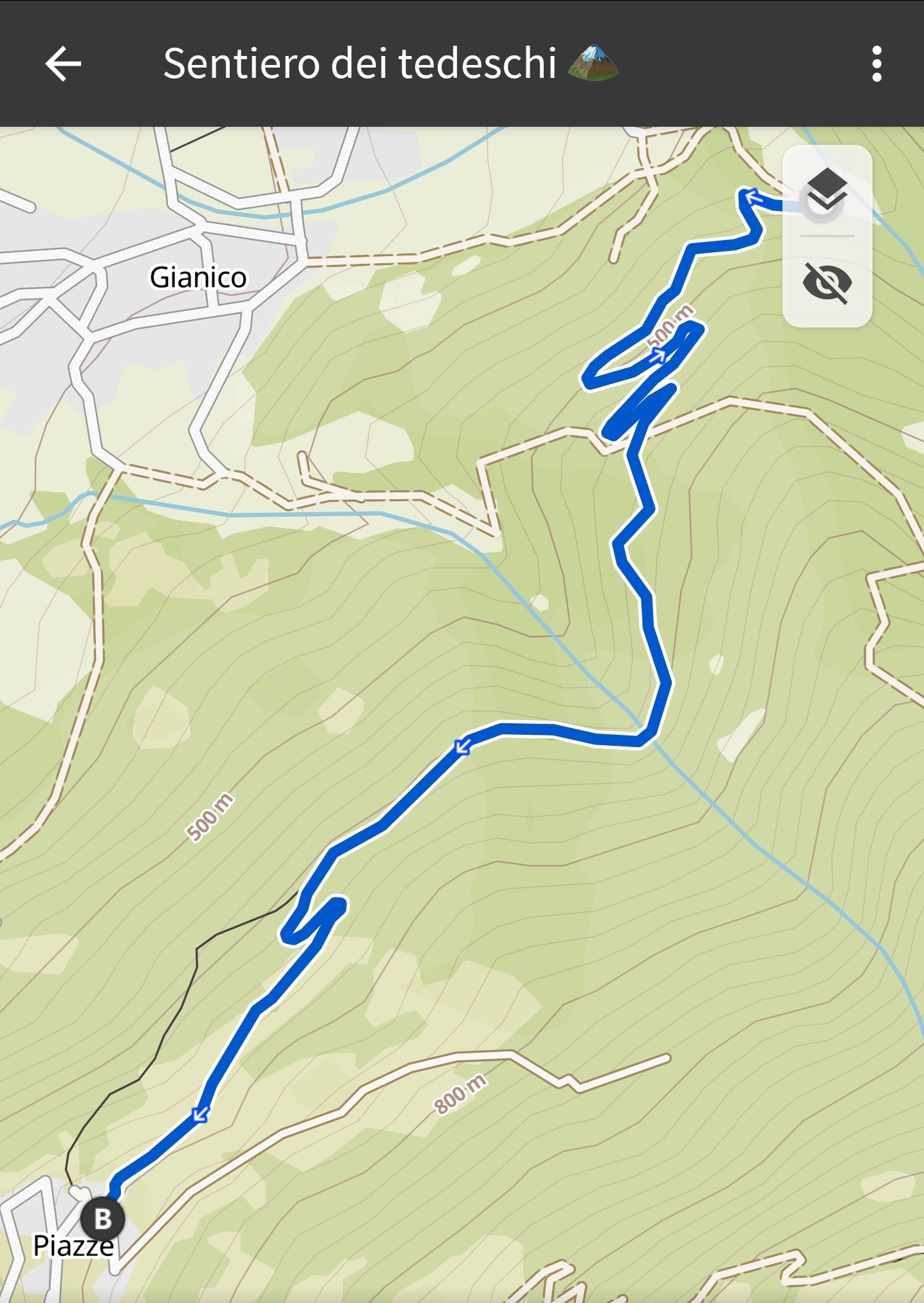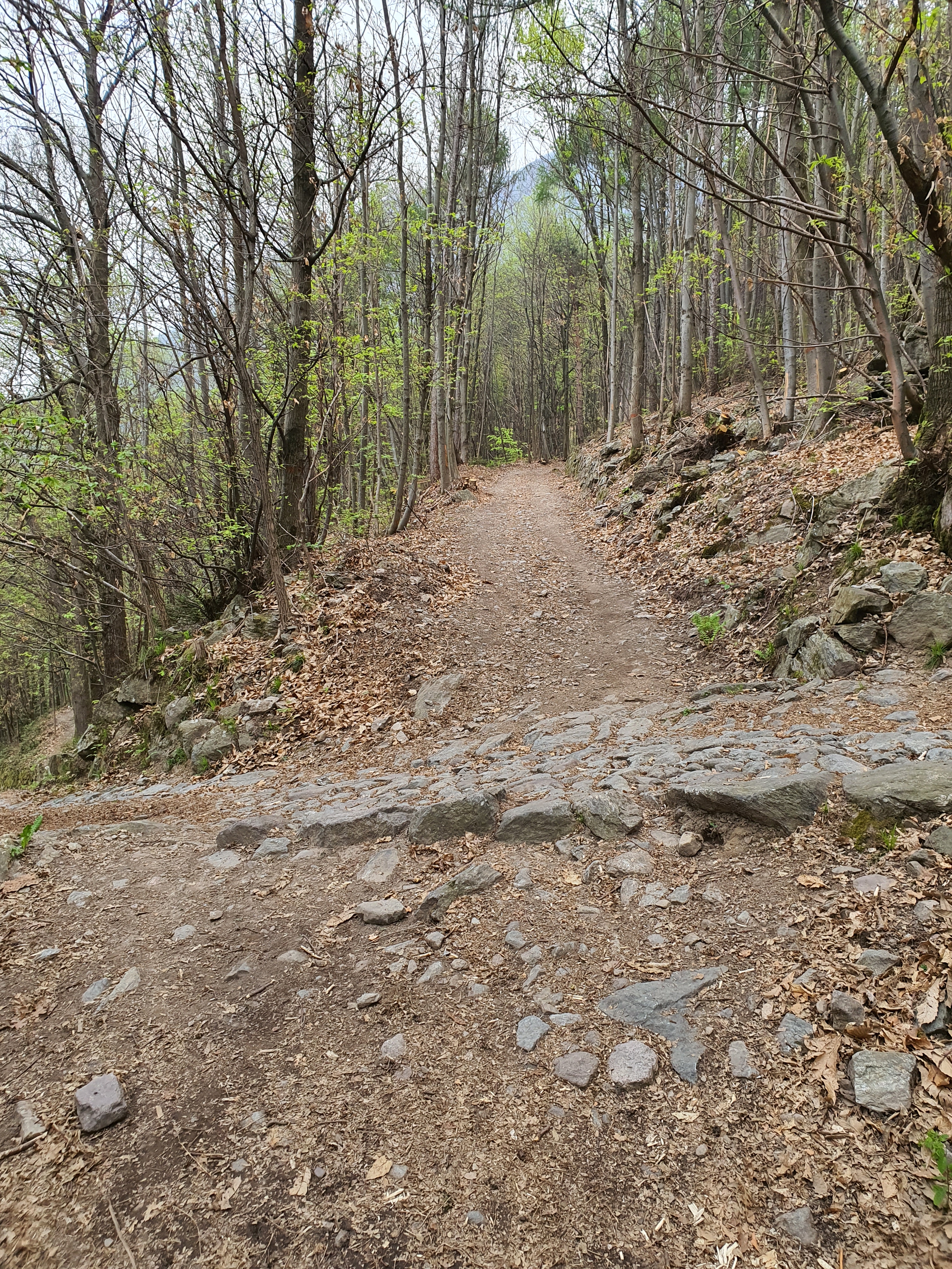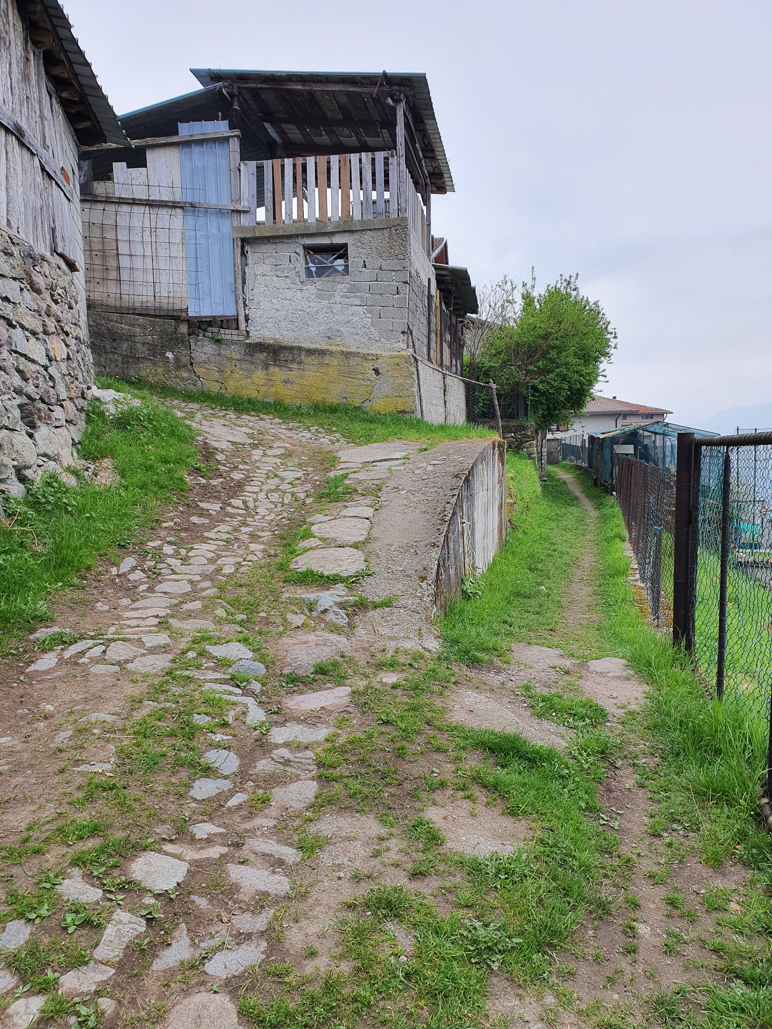 Continuiamo quindi lungo il rettilineo . Ad un certo punto incontreremo altre 2 biforcazioni , a sinistra andremo sempre a piazze ma lungo una mulattiera molto disconnessa (•24) , mentre a destra scenderemo tra artogne e giancio . A questo punto dovremo salire la curva più ripida di tutto il trail (•25) .