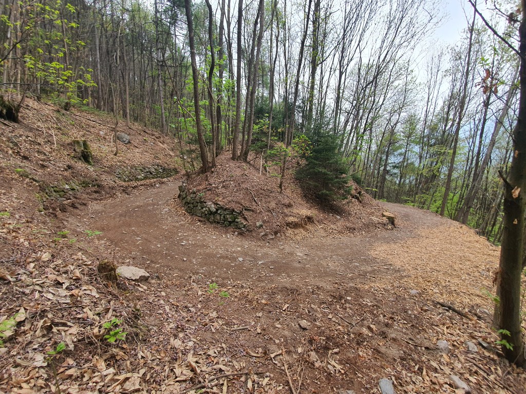 Ad un certo punto incontreremo il secondo curvone flow (•12) . Continuiamo e dopo un rettilineo giungeremo ad un’altro passaggio su strada (•13) . Sulla sinistra vedremo un piccolo taglio molto bello da fare in discesa (•14) . Ennessimo taglio della strada . Saliamo a sinistra dei cartelli segnaletici e riprendiamo Il sentiero propio sopra di dove siamo usciti , facendo una sorta di inversione a U (•15) .