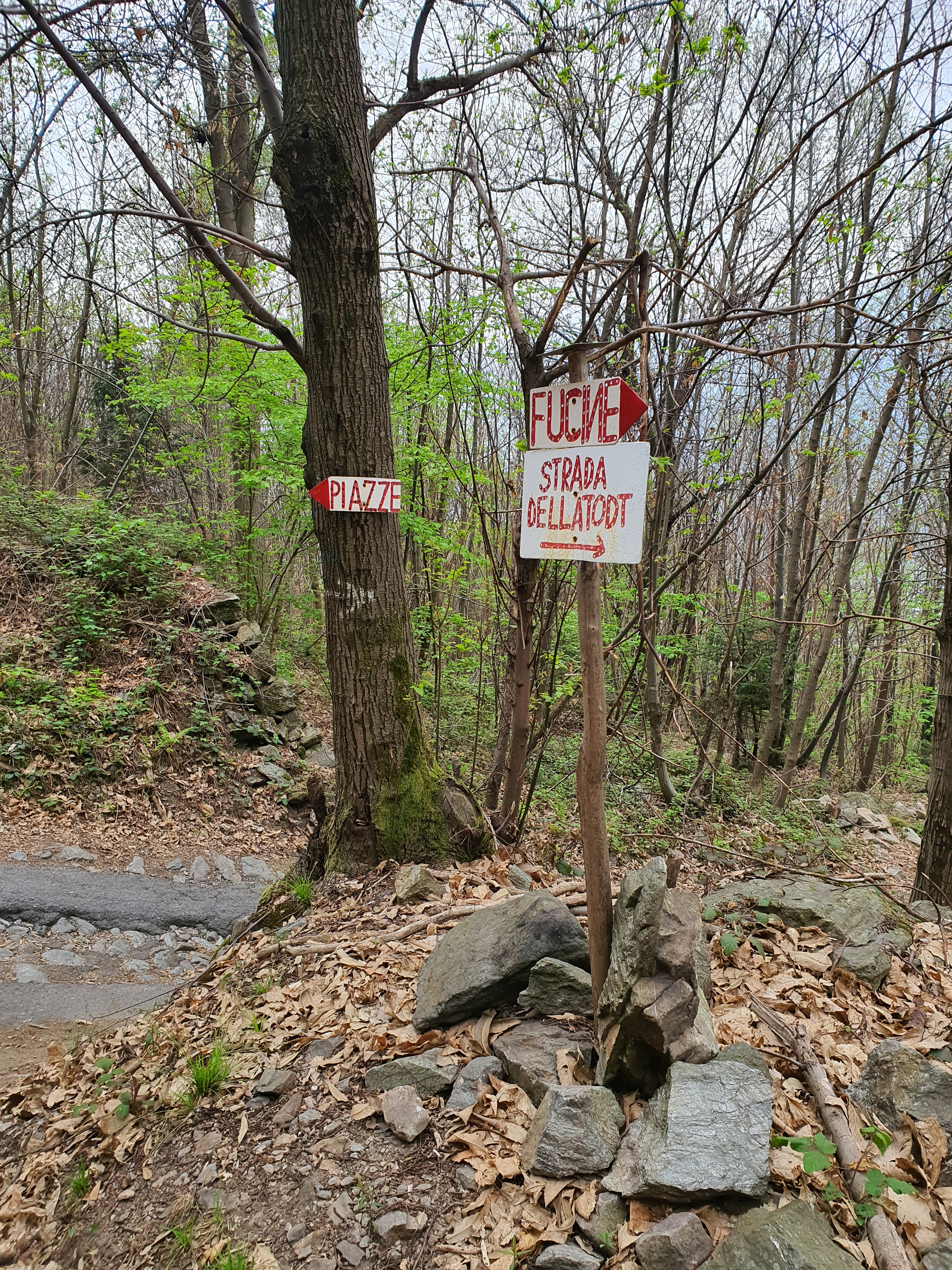 (•1)📍Per prendere il sentiero ci dobbiamo dirigere in località fucine di darfo B.T . Saliamo dalla strada Principale che passa nei pressi del mulino della plagna fino al torrente rimidì , ad un certo punto troveremo una biforcazione a DESTRA (•3) con cartello annesso , “strada della todt” (•2) . Il nostro trail inizierà qui !