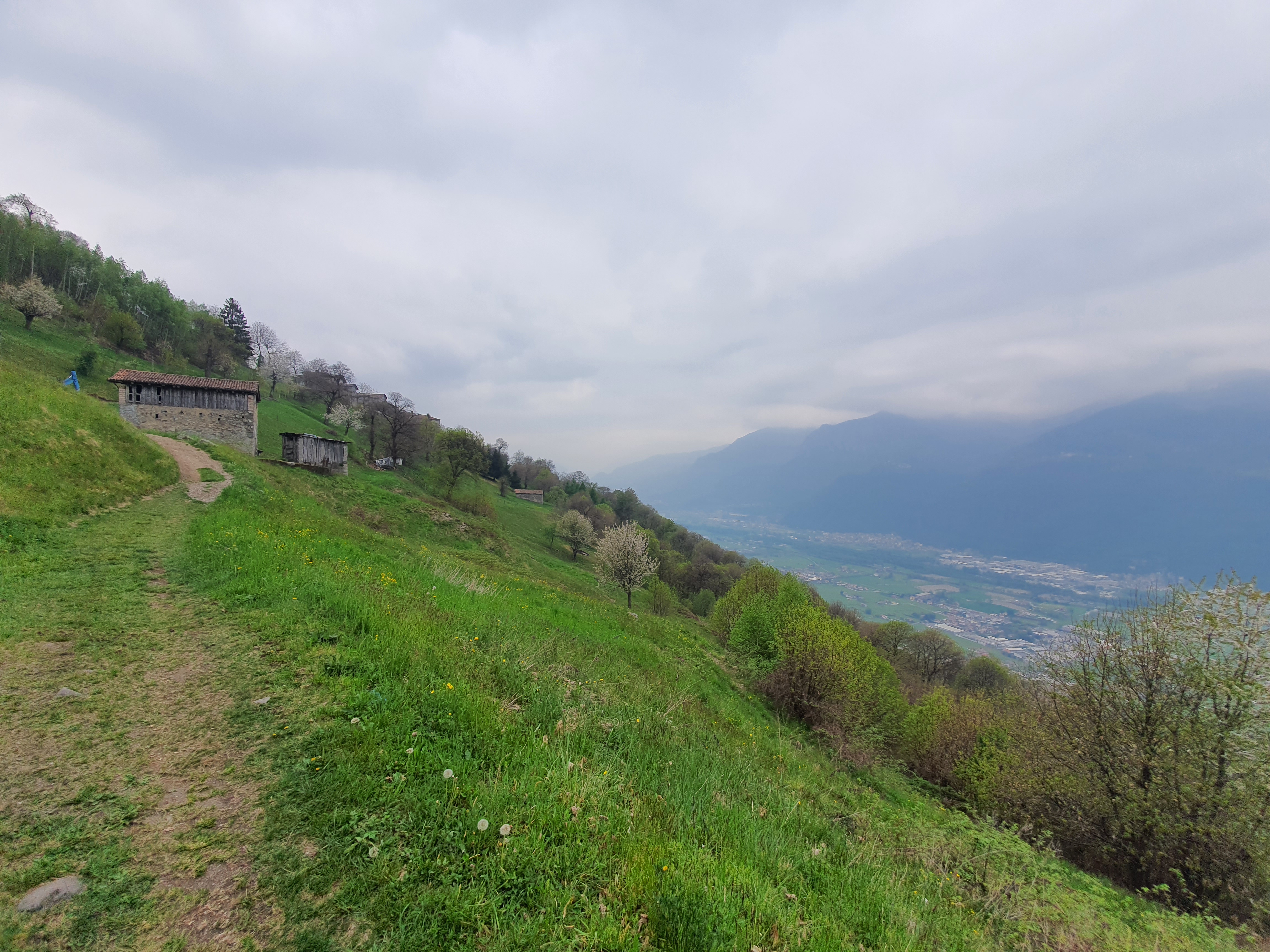 Facciamo un’altra curva più dolce e ancora un rettilineo di 4/500 m . A questo punto incontreremo un’ostacolo a slalom (antimoto) (•26) . Siamo quasi giunti a piazze , qui si aprirà il bosco e cominceremo a intravedere i primi scorci di panorama sulla media/bassa vallecamonica , lago d’iseo compreso (•27) .