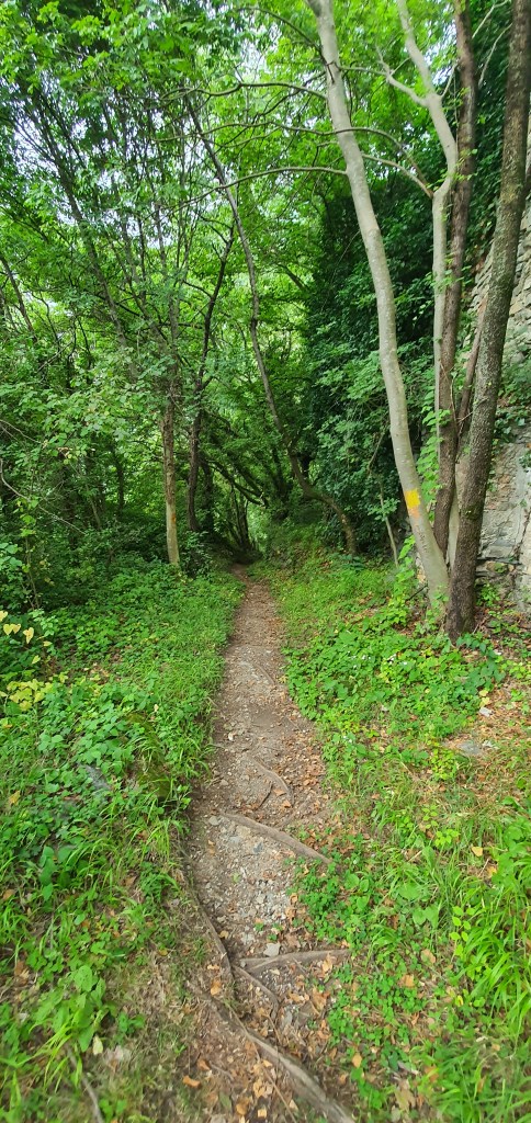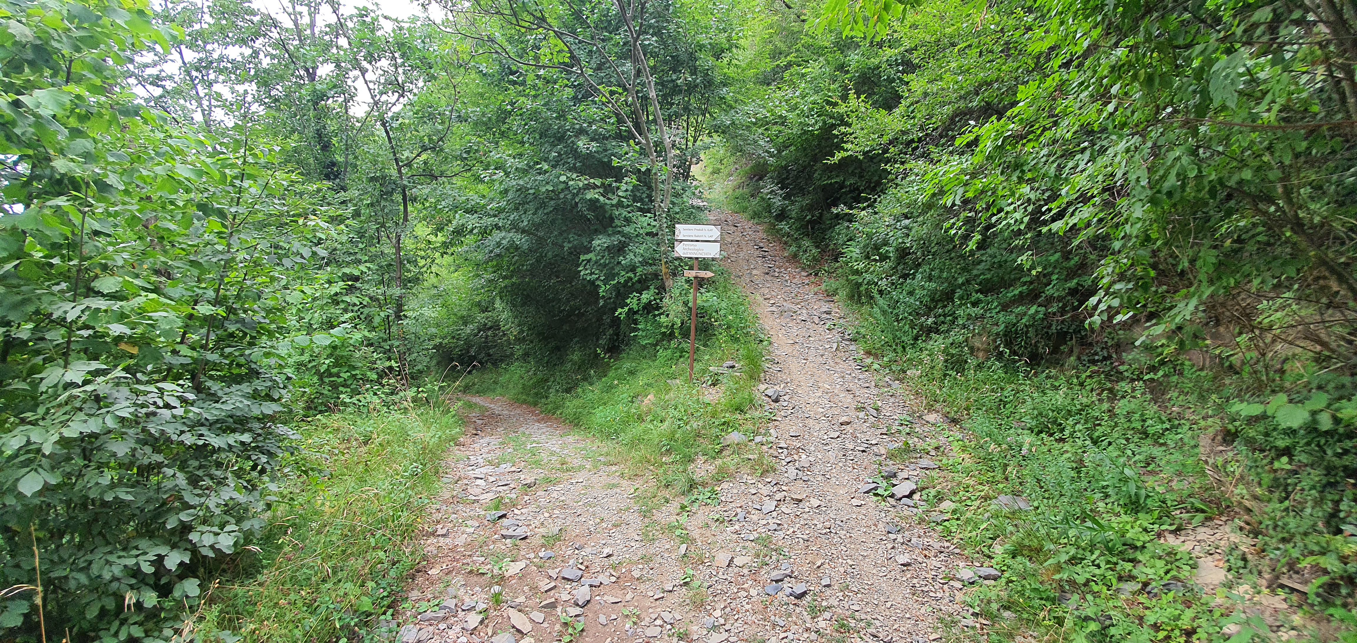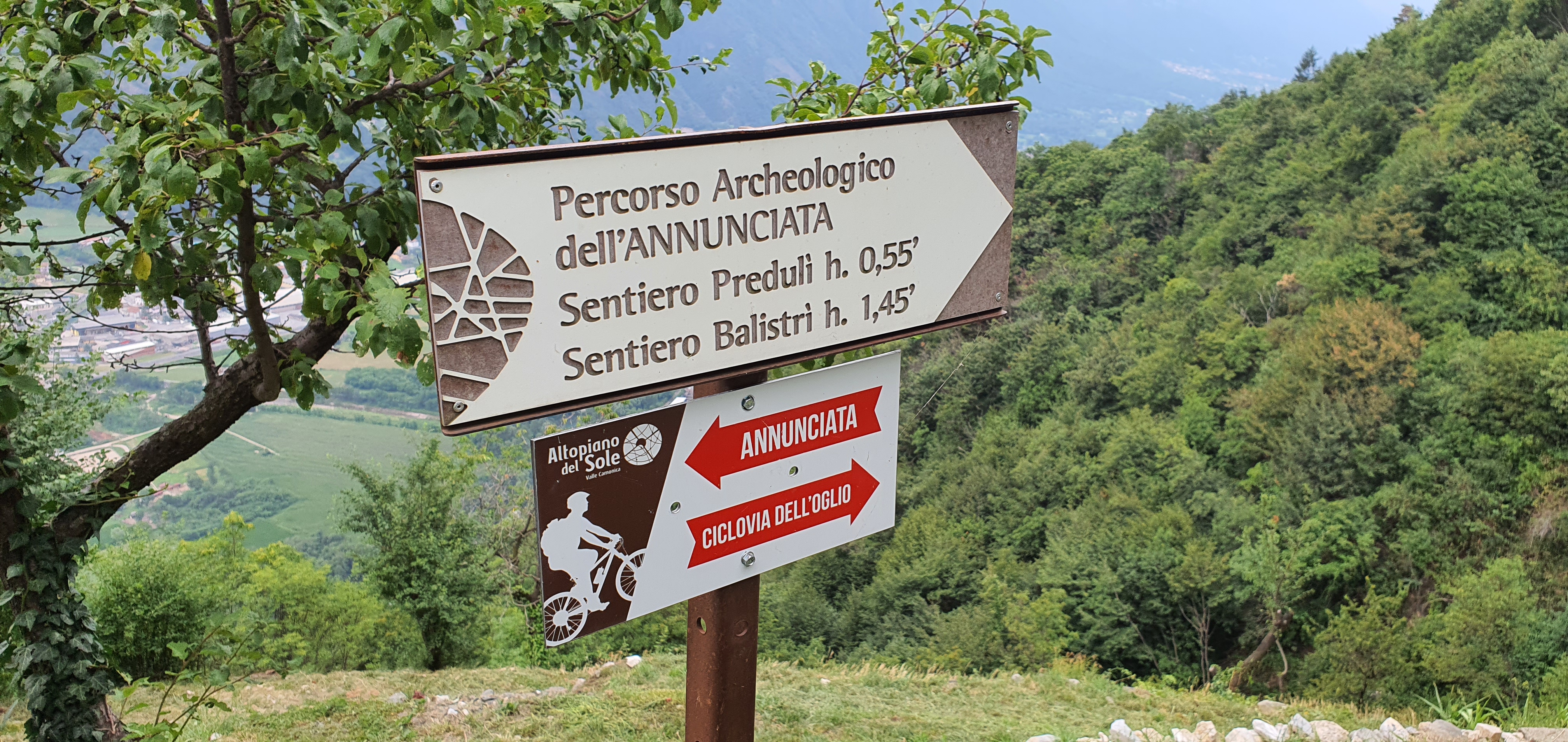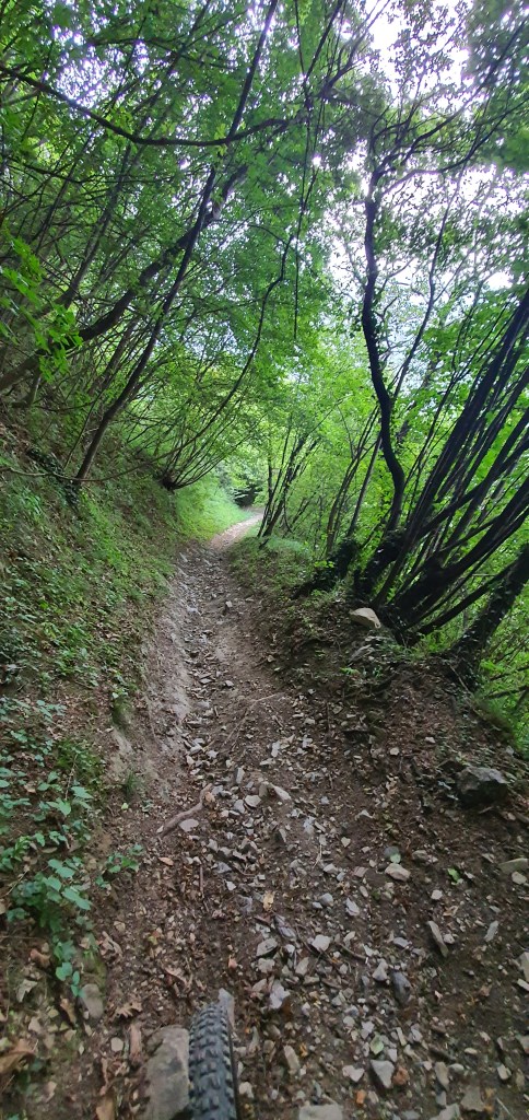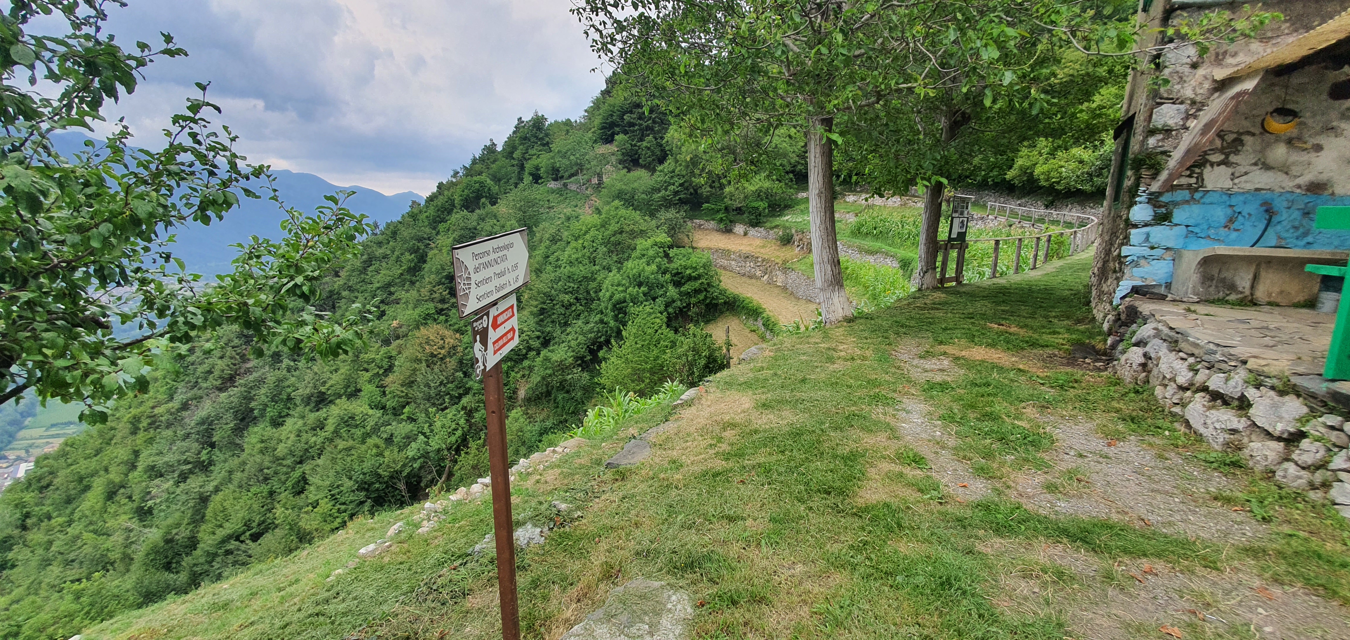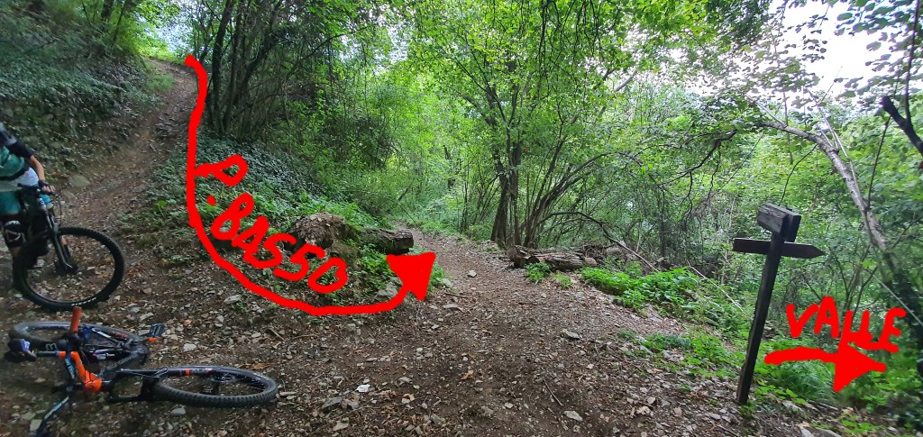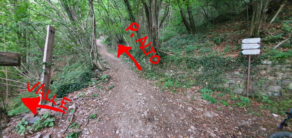 Inizialmente il trail sarà molto largo (•3) , quasi una mulattiera , e non ci si potrà sbagliare , essendo spesso segnalato da cartelli che ne indicano la direzione . Troveremo anche diversi tavoli da pic-nic e dei cartelloni informativi sulla fauna e la vegetazione locale , (•4) a fianco del sentiero . NB (i cartelli indicheranno spesso la ciclovia dell’oglio ed il percorso archeologico dell’annunciata (•5) . Incontreremo anche un bivio che scende a sinistra e che si ricongiungerà con la strada dell’annunciata sottostante , ma non prendendetelo in quando poi diventerà piuttosto impedalabile . Più avanti Incontreremo il primo bivio importante sulla destra (•6) , ma noi andremo a sinistra , perchè Salendo verso destra andremo a percorrere il PREDULÌ ALTO , che aggiungeremo in questa pagina come variante del percorso molto più impegnativa . entrambi si ricollegheranno verso la fine).