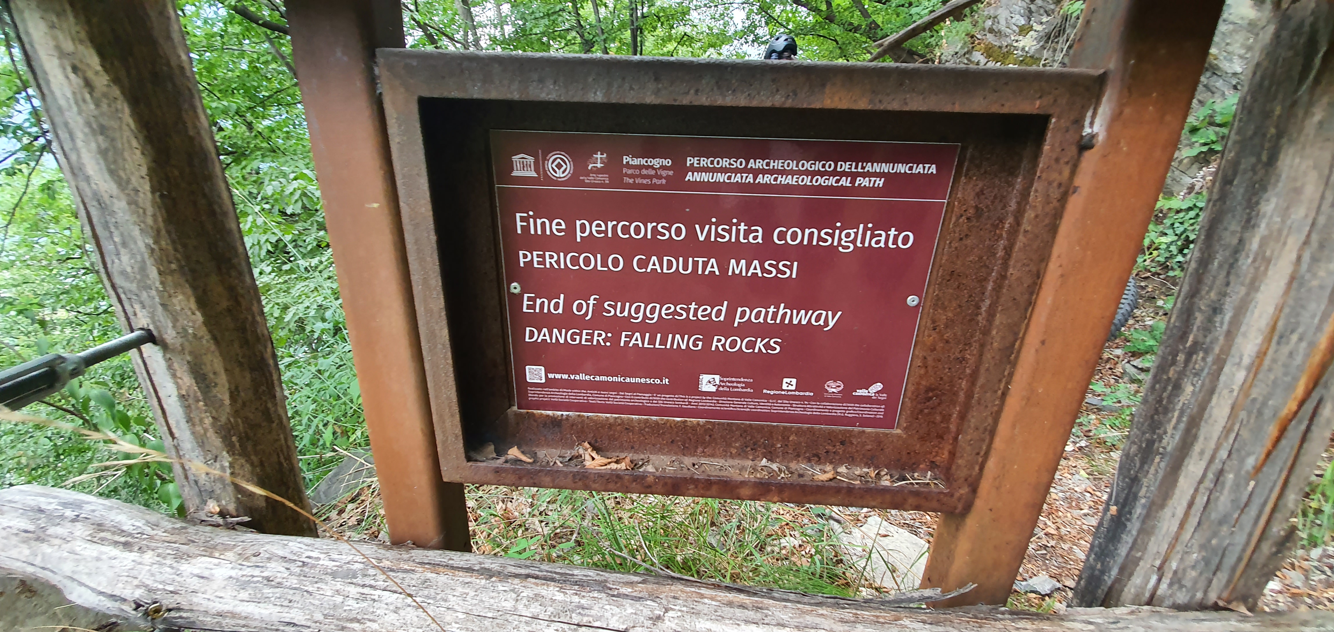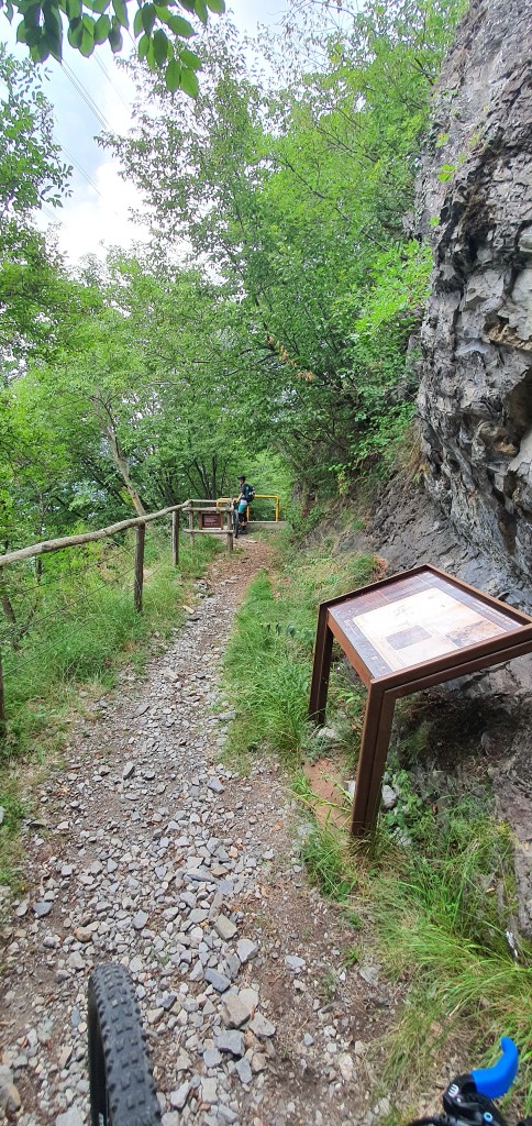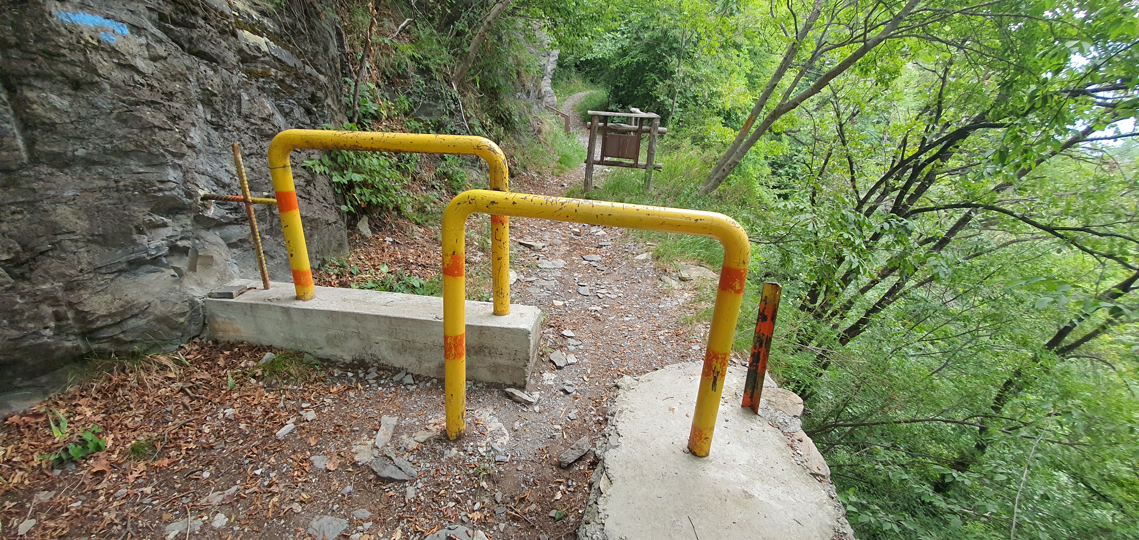 Il cartello che indicherà il pericolo di caduta massi , coinciderà anche con la fine del percorso di visita consigliato (propio per la caduta dei massi) . Qui il sentiero verrà sbarrato da due “ringhiere” di colore giallo , posizionate sopratutto per evitare il passaggio delle moto (•13) . Dovremo dunque alzare le nostre ebike ed oltrepassare questo ostacolo , facendo attenzione al bosco a sinistra piuttosto ripido .