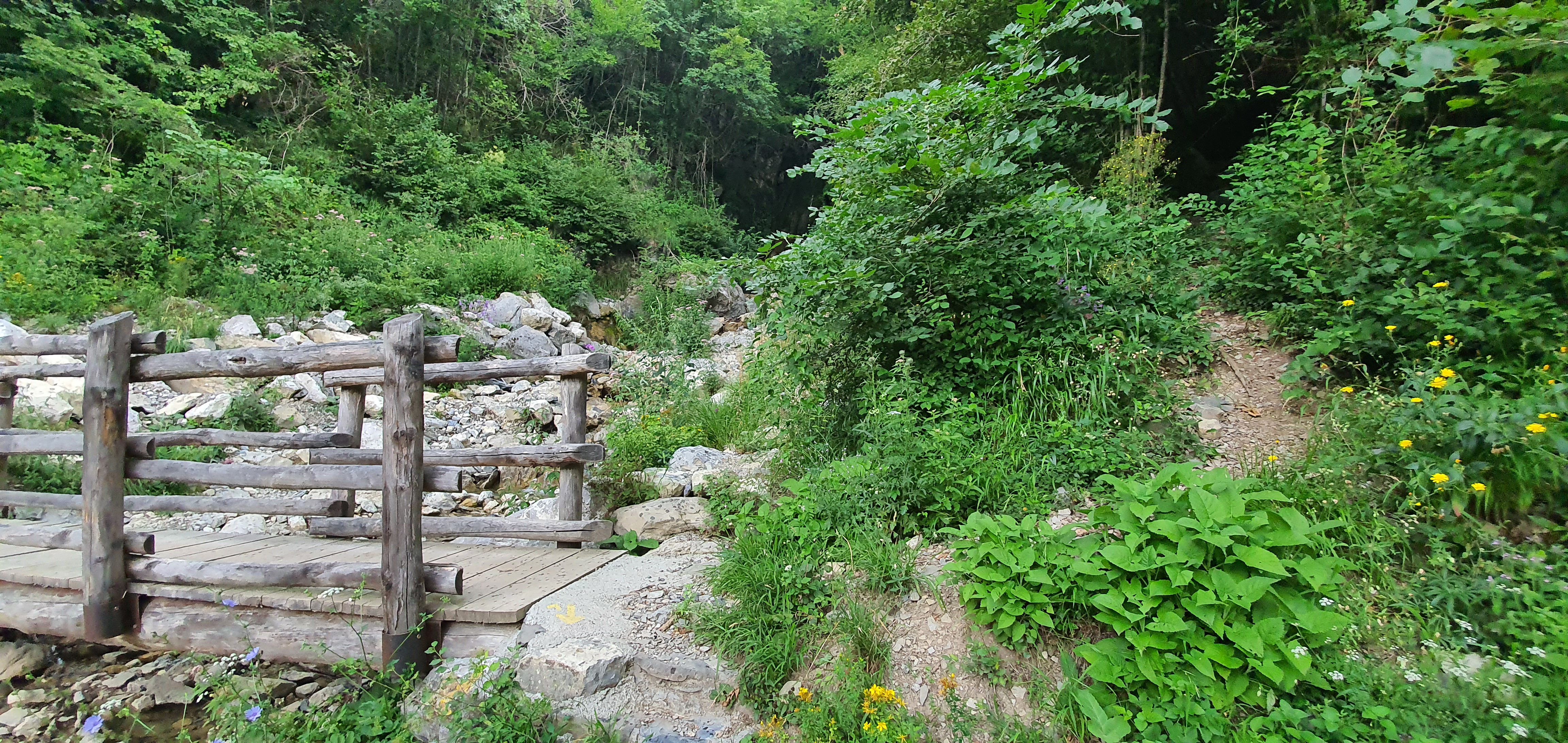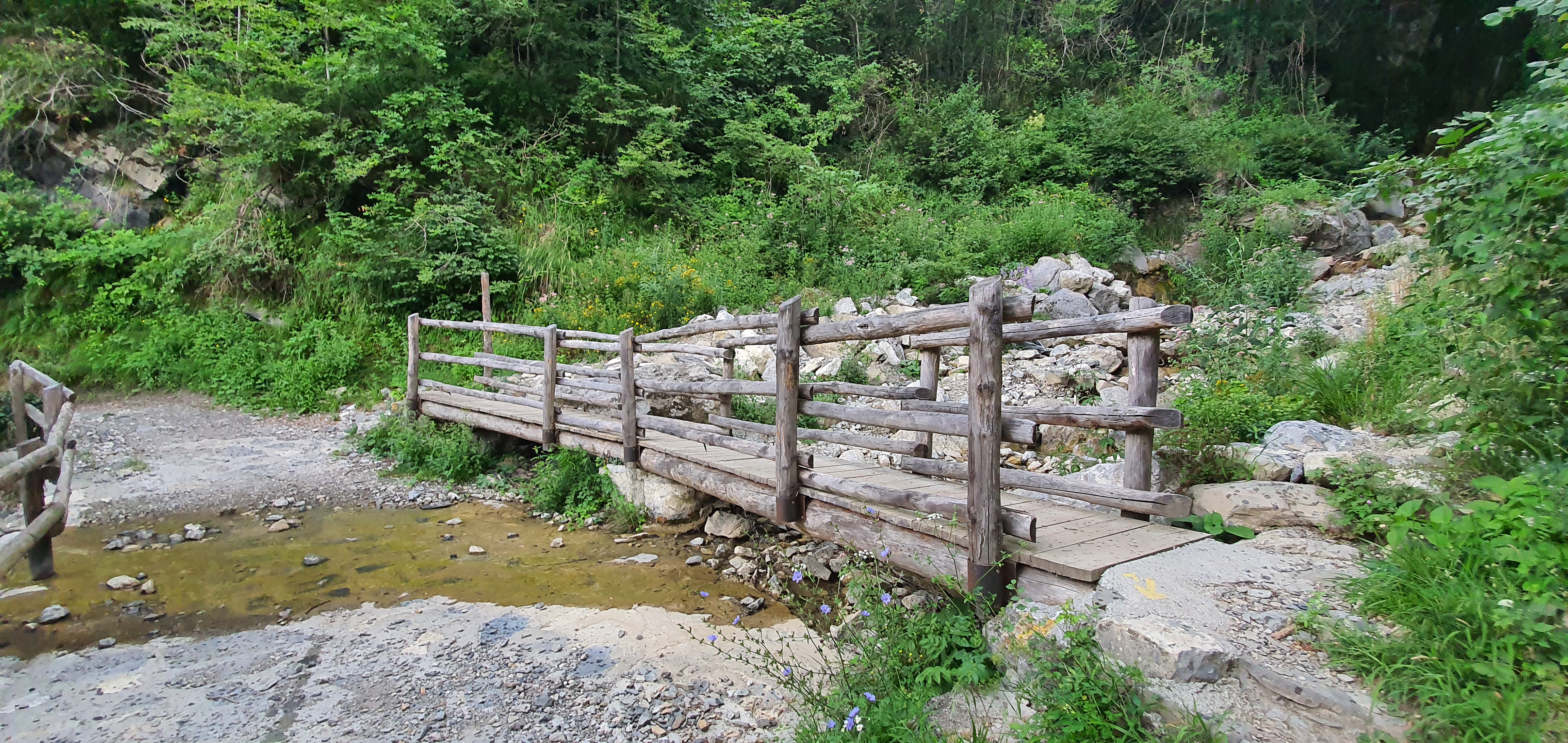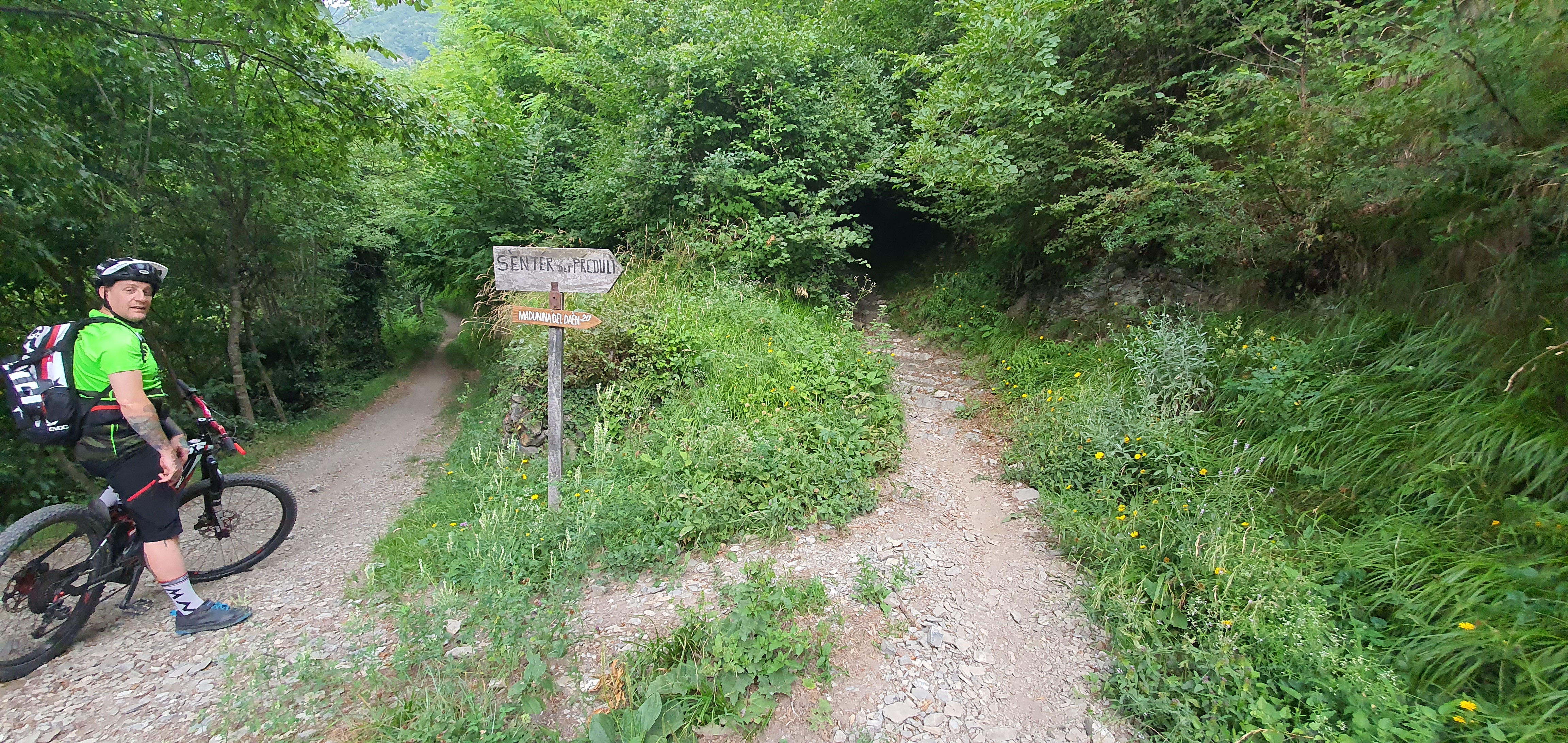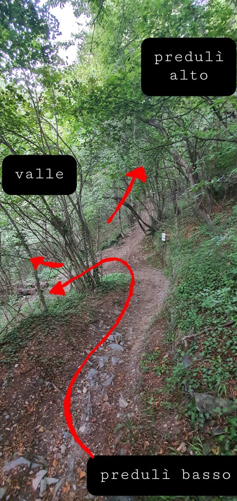 Alla fine della discesa ci troveremo di fronte ALL’ULTIMO BIVIO , il più importante del percorso (•21) . Un cartello indicherà le direzioni (•22) : Di fronte troveremo un sentiero che sale che non sarà altro che la parte finale della discesa del PREDULÌ ALTO . Il sentiero che scenderà nel mezzo verso la valle , arriverà al ponte della valle stessa , evitatelo se non siete esperti , in quanto è molto ripido e le curve sono molto strette . NOI DOVREMO SCENDERE A SINISTRA , verso l’ultimo tratto che ci condurrà alla fine del percorso .