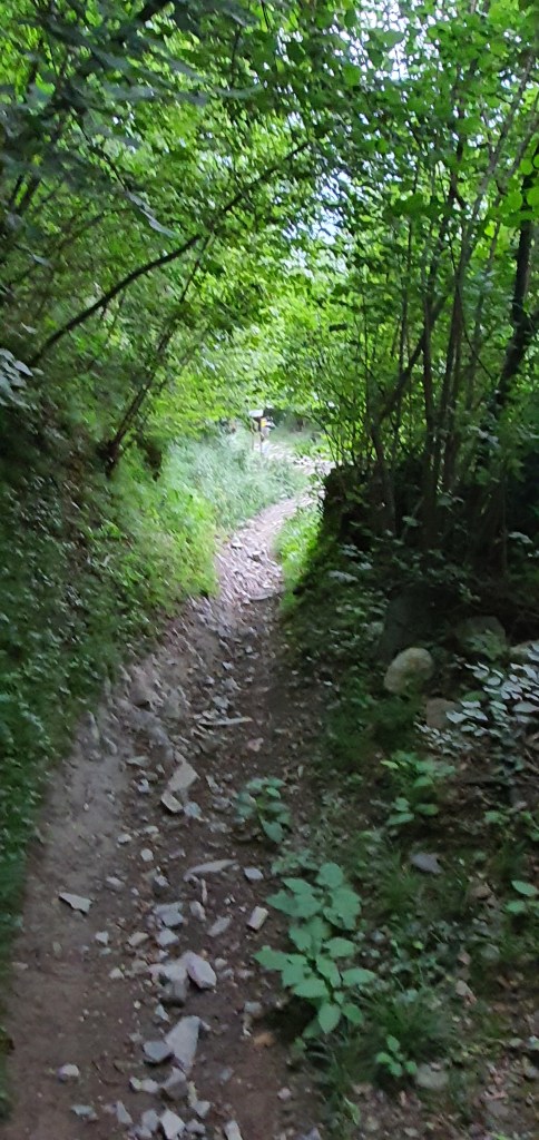 Dopo la panchina scendiamo ancora , il fondo in questo punto diventerà più sdrucciolevole , e sarà composto da sassi fissi ma che in caso di pioggia potrebbero diventare molto scivolosi (•9)