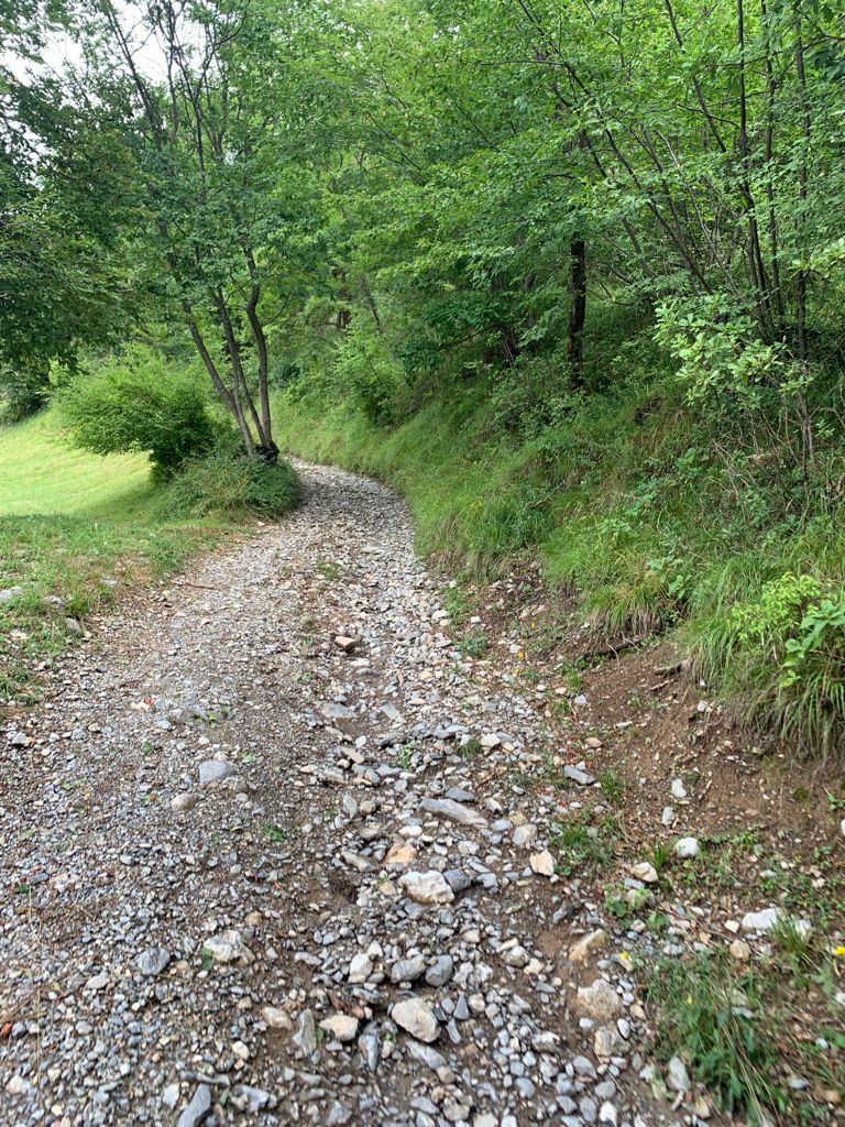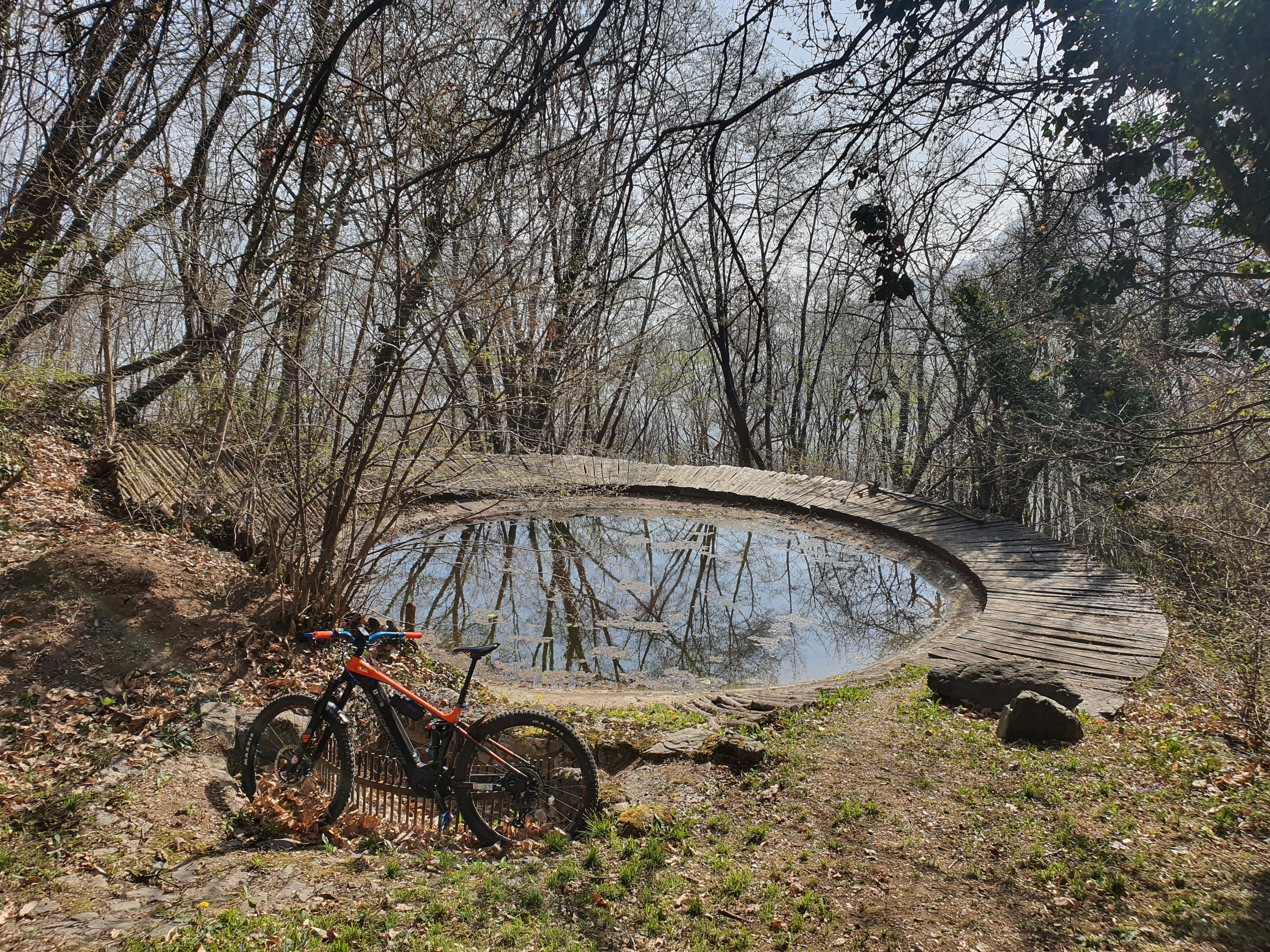 Al bivio giriamo a sinistra e continuamo lungo la mulattiera (•5) che ci condurrà fino al prato di gorzone . Lungo la salita incontreremo un’altro bivio verso la madonnina azzurra , ma noi continuamo fino in cima , dove la strada terminerà ad un laghetto (•6) propio sotto al prato alto di gorzone (•7) . L’ultimo tratto avrà alcuni strappi un pò ripidi ma nulla di troppo impegnativo con l’ebike .