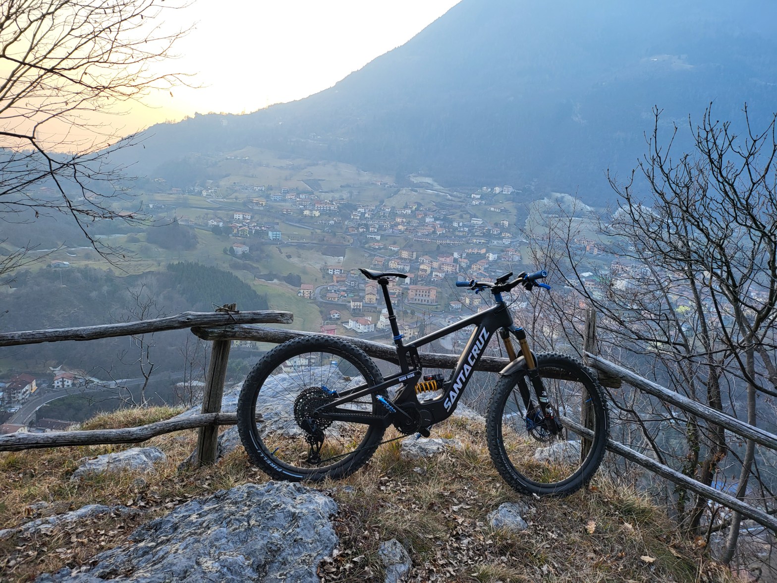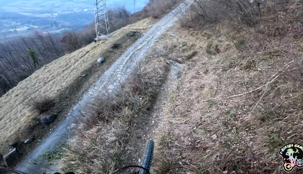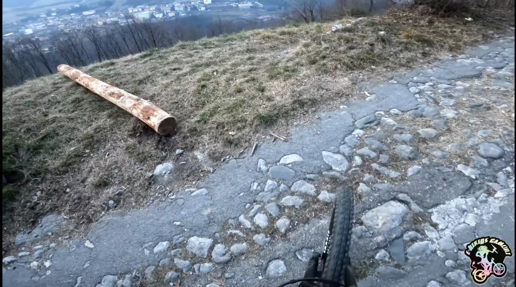 Girata la curva ci troveremo ad un punto molto bello per scattare una foto . Ci sarà sulla destra una panchina in legno (●13) e sulla sinistra una staccionata con vista su angolo terme (●14). Il trail qui continuerà a scendere gradualmente (ci sarà anche un piccolo sasso che potrete usare come drop)
