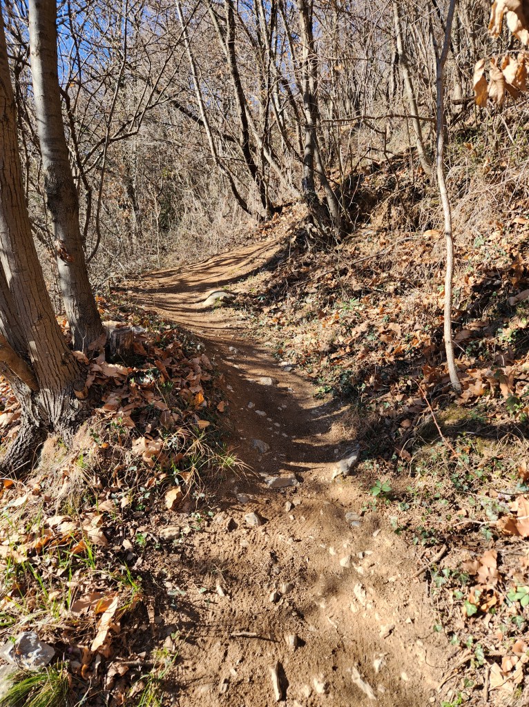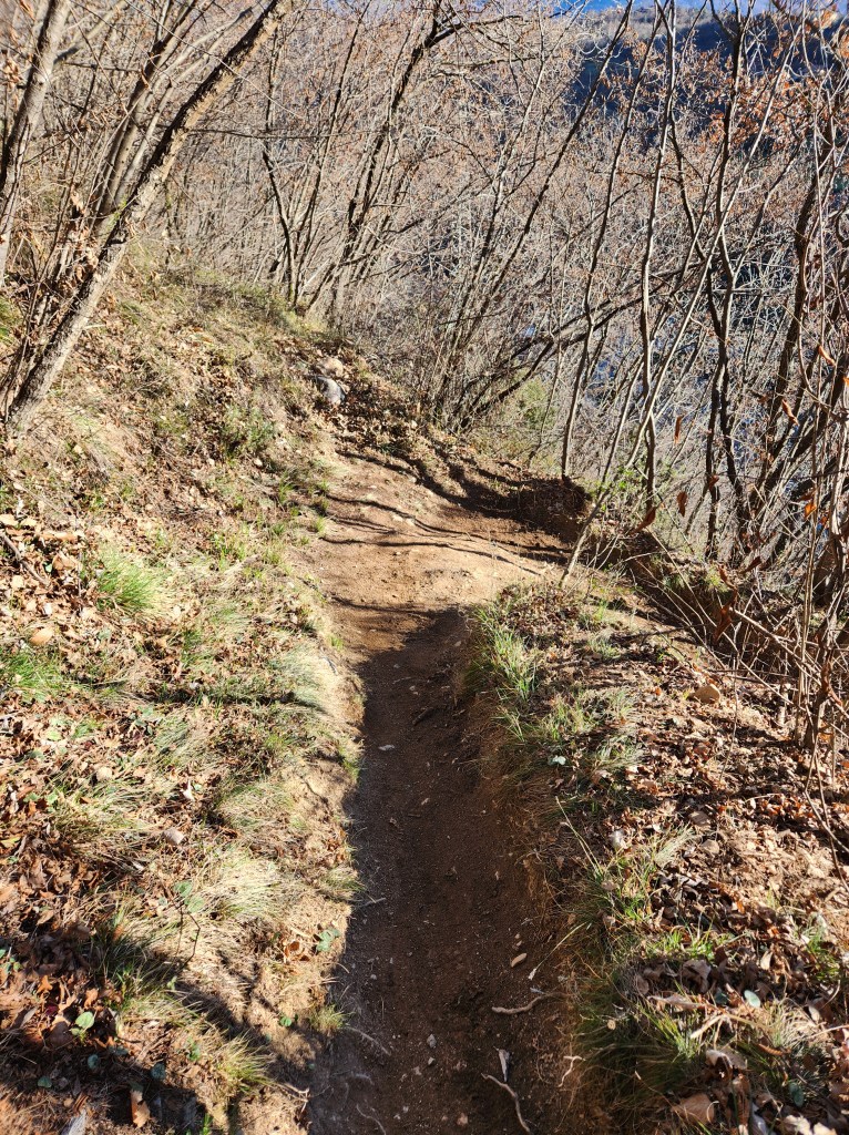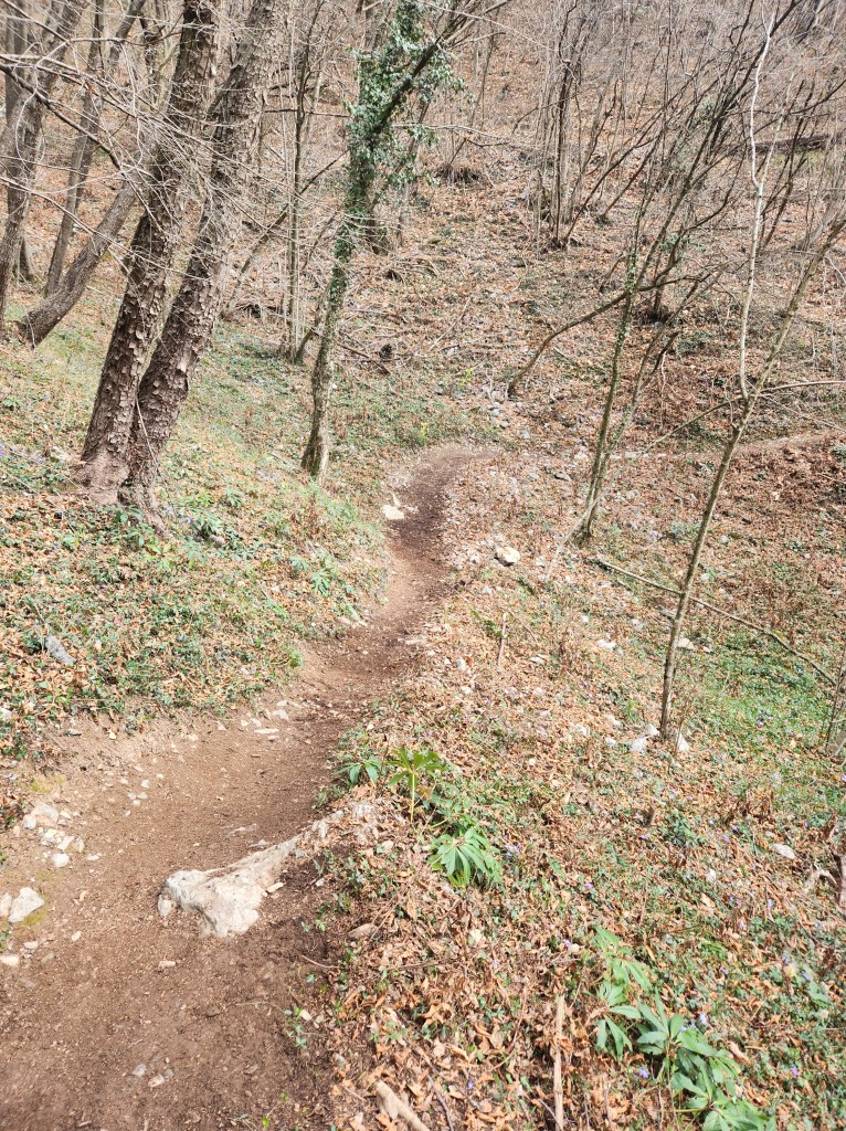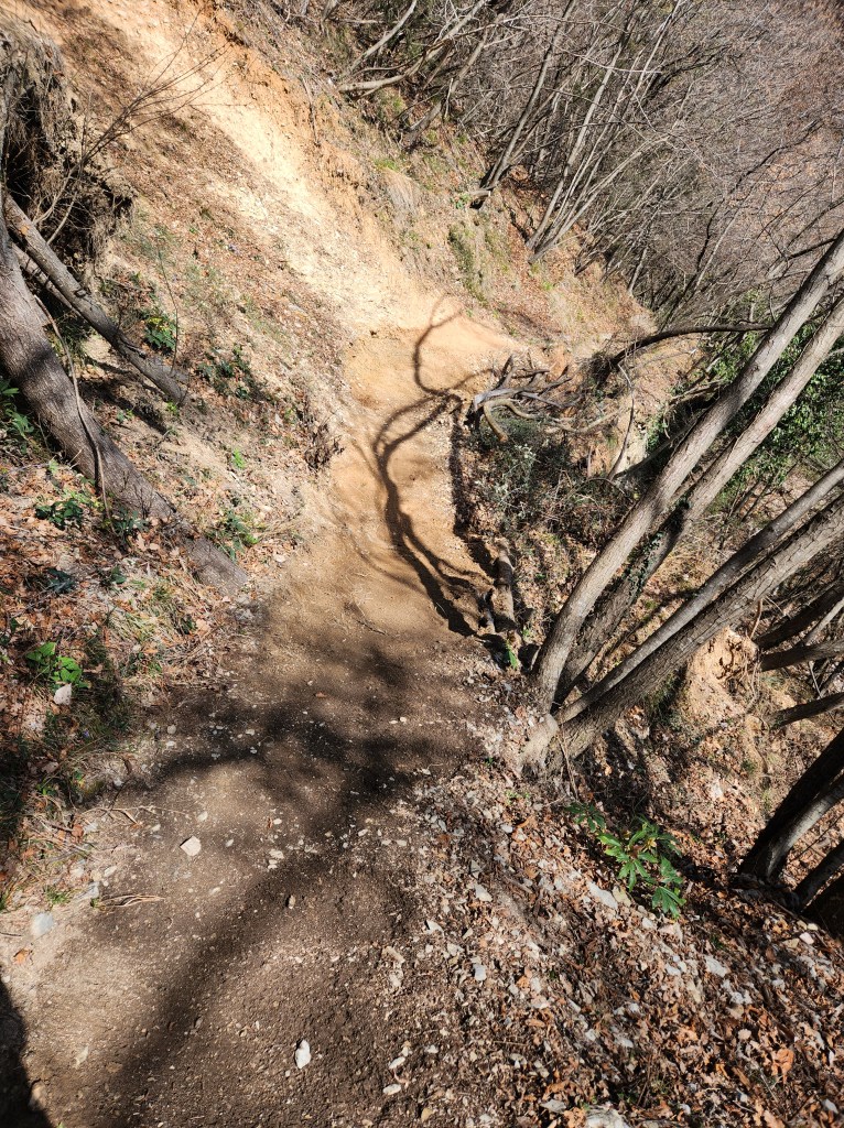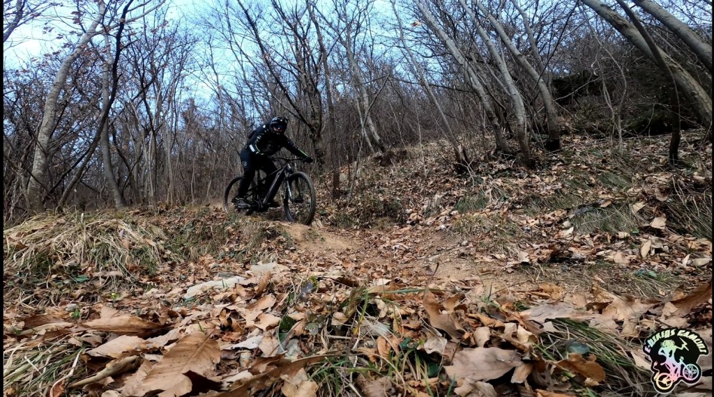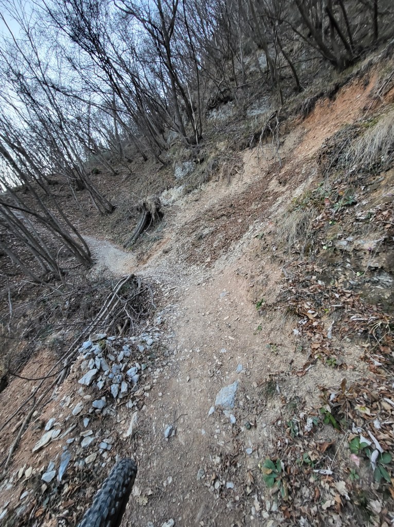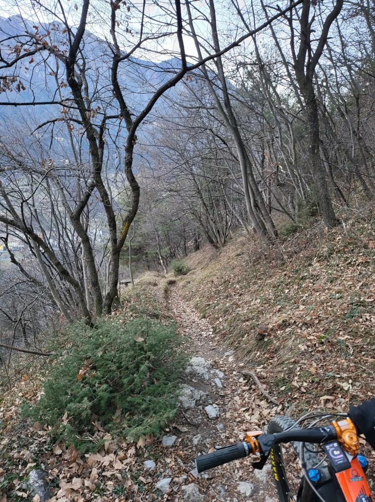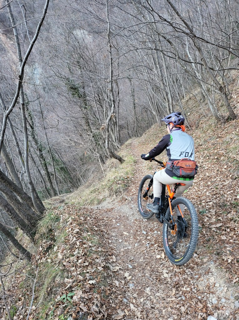 Arrivati in cima alla salita ci ritroveremo all’interno di un singletrack scavato nel bosco (●7) e quasi pianeggiante . La vista sarà magnifica , ma Anche qui i primi 2/300 metri state attenti a non sbilanciarvi verso sinistra in quanto è piuttosto ripido (●8). Finito il tratto “pericoloso” , comincerà finalmente la parte bella del percorso (●9) , che andrà via via a diventare più ripido e tecnico .