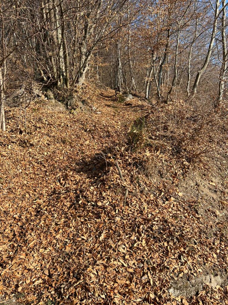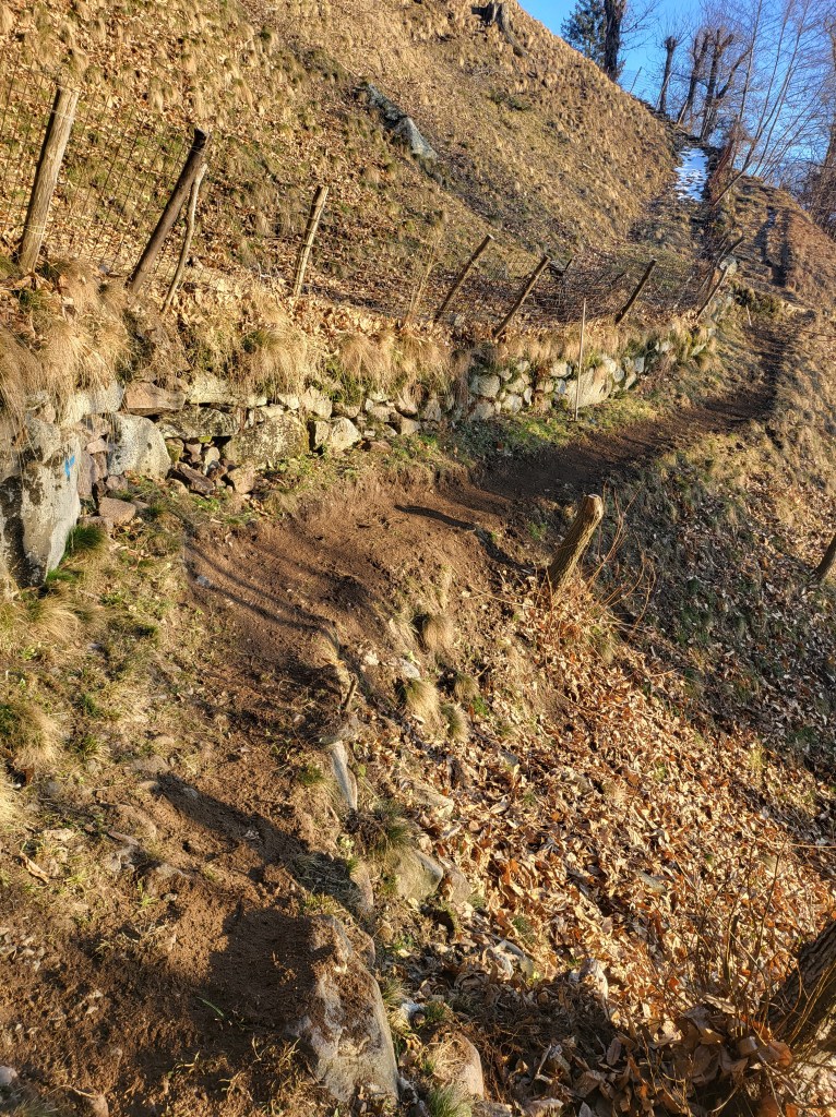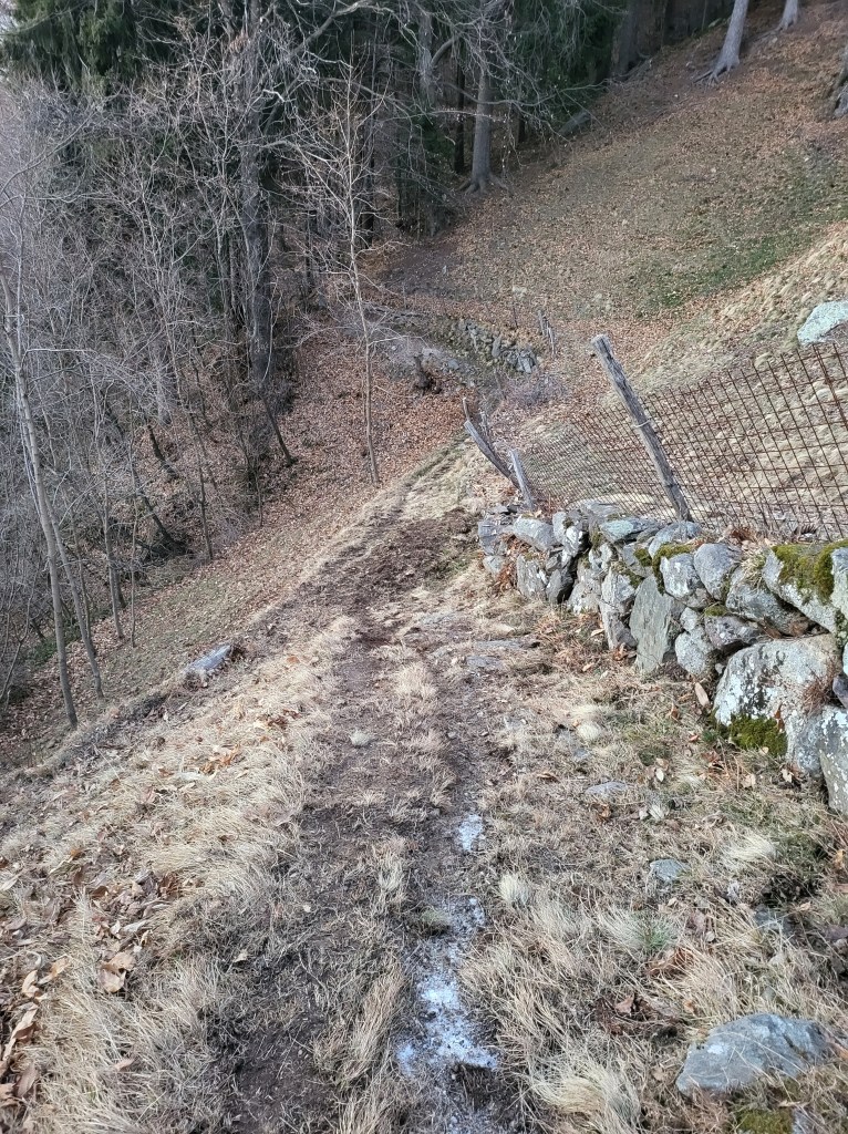 Il percorso da qui in avanti sarà di fianco ad un prato separato da una rete (•29) , e sarà piuttosto scorrevole . Poco più avanti ci addentreremo in un “canalone” di fianco ad un Muro di rocce (•30).