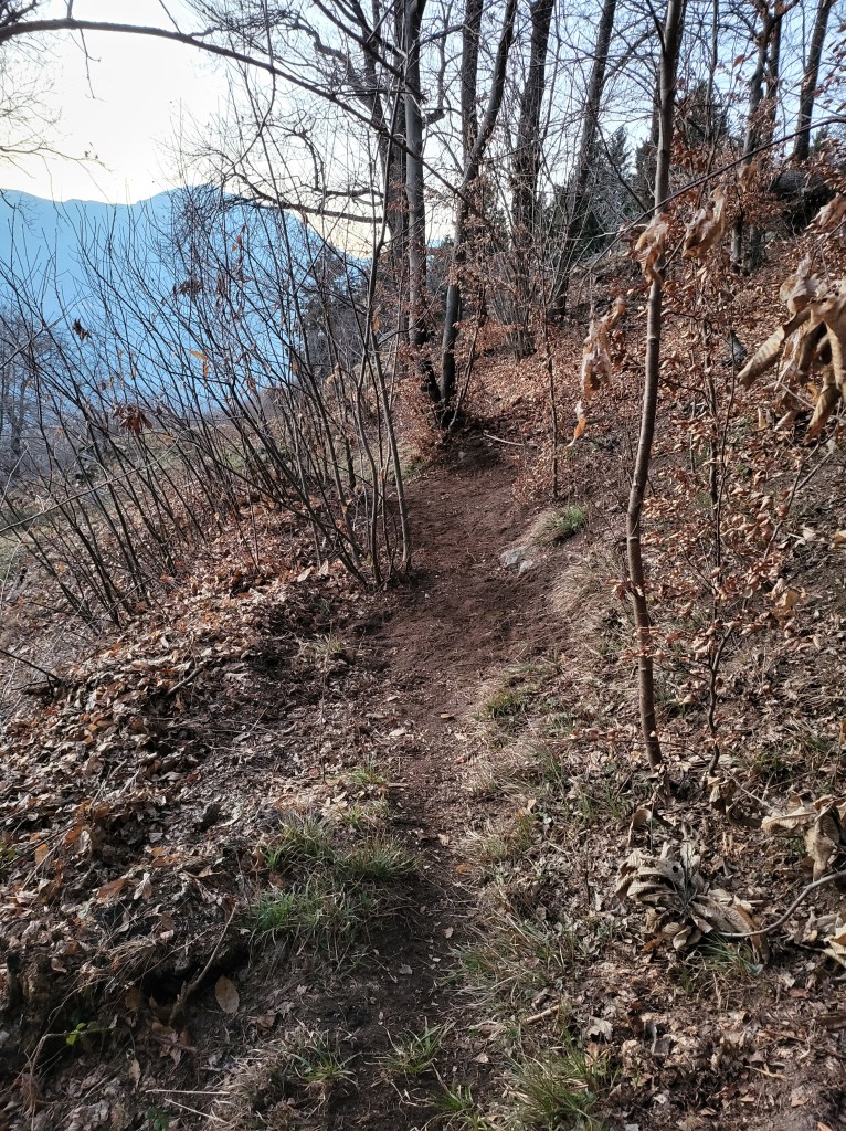 Subito ci troveremo davanti a 2 bivii . Al primo andremo a sinistra (•7) , mentre al secondo andremo a destra (•8) . Vi basterà comunque seguire le tracce BLU sui sassi e sulle piante , anche se difficilmente non riuscirete ad intravedere la traccia del sentiero in quanto sarà molto evidente nel terreno pulito .