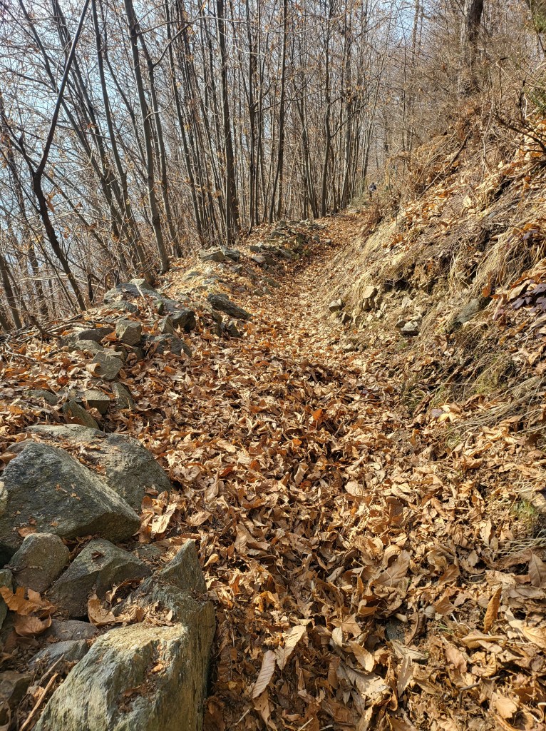 Da qui scenderemo dall’asfalto per circa 5/600 metri . Finché non incroceremo una mulattiera sulla nostra destra (•18)