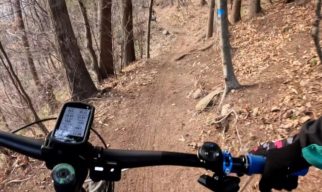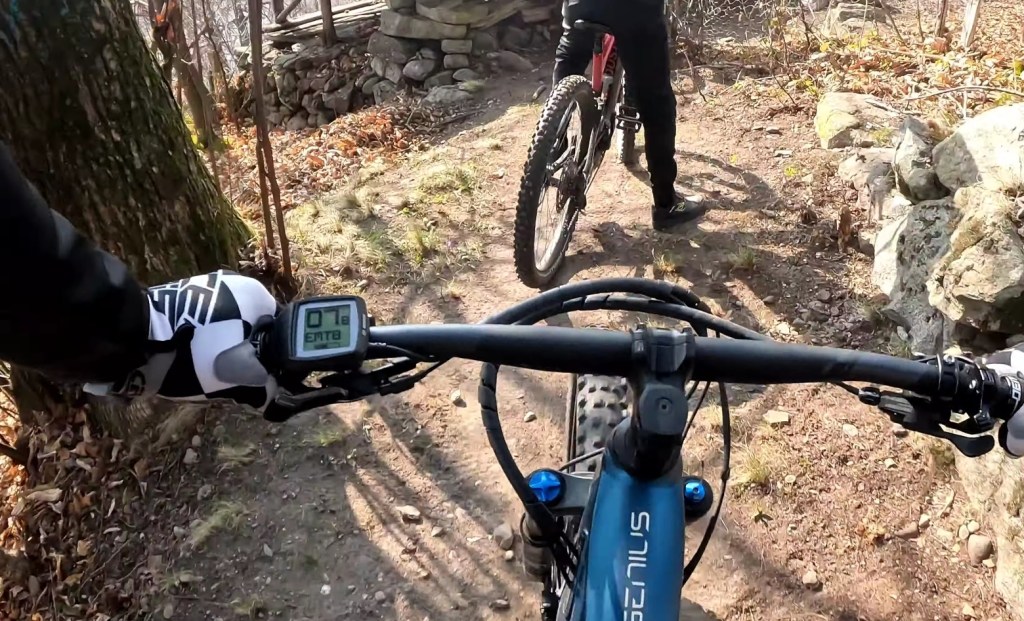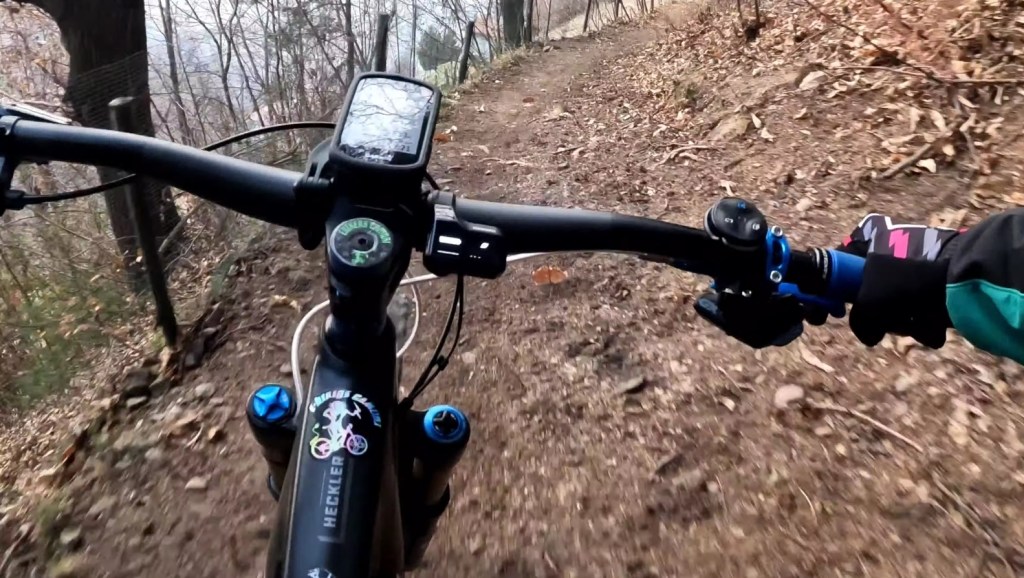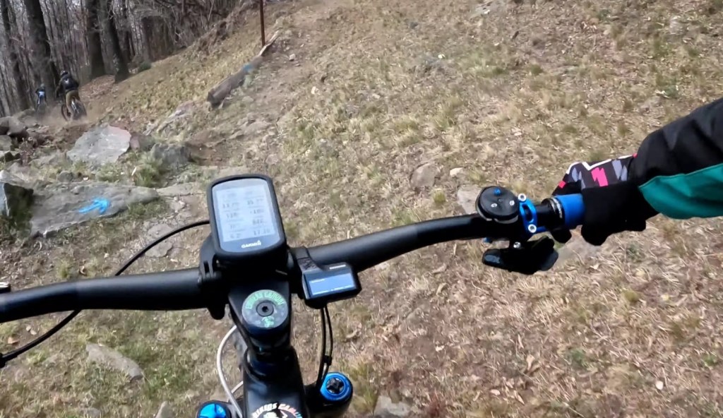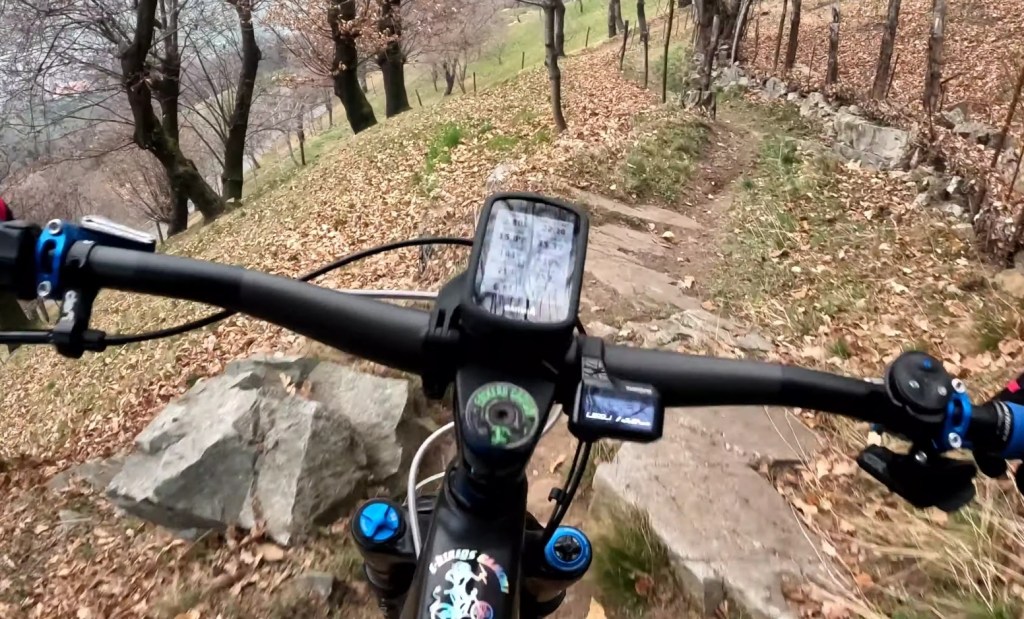 Superato il drop ci troveremo in un tratto più flow (•11) . Passeremo una piccola vallettina , ed eccoci su di un terreno diverso , questa volta composto da sassi e leggermente più tecnico (•12) . Passato questo tratto , incontreremo una linea scavata nel prato (•13) che scendere verso un’altro drop creato da un muretto artificale (già esistente) (•14) . Anche qui potrete passare a sinistra evitandolo .