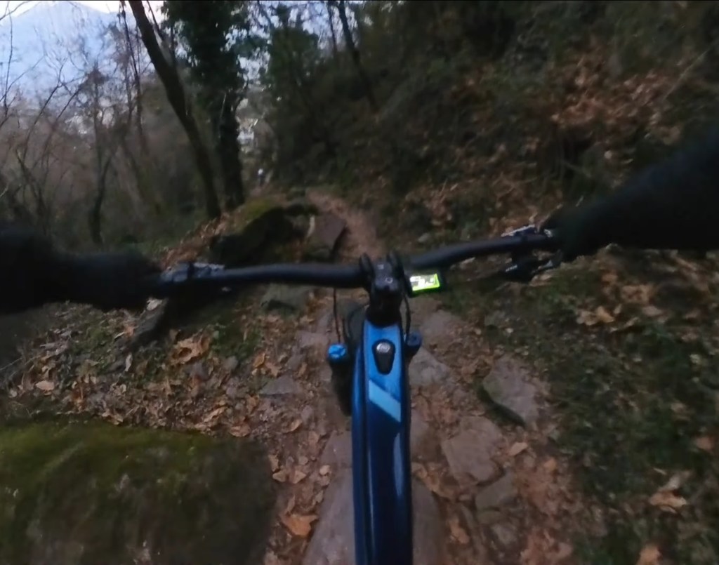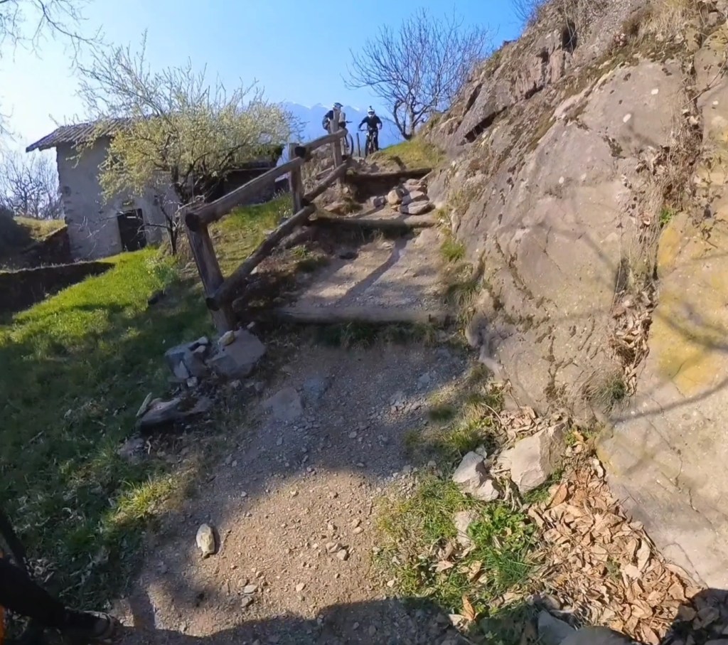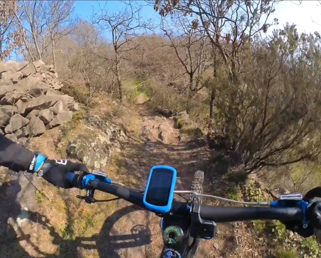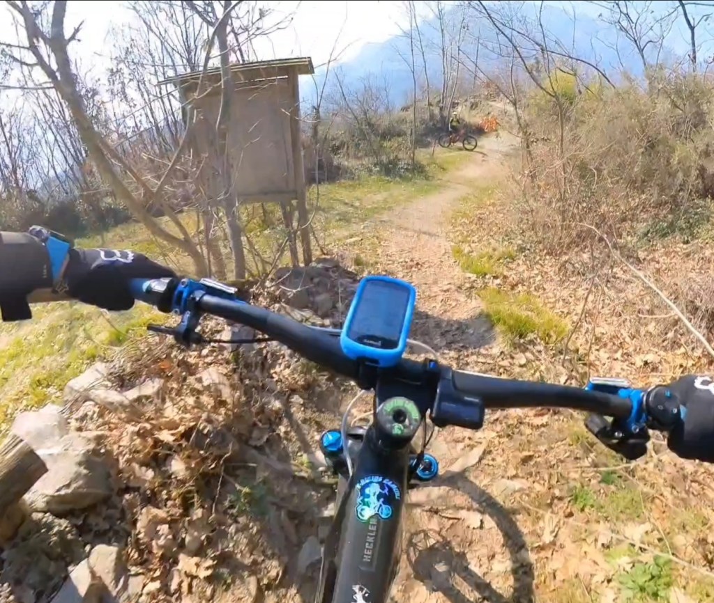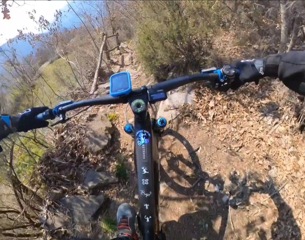 Qui seguiamo la traccia a terra . Subito a destra scenderemo subito nel sentiero classico di capo di lago . Ma dovremo calare le bici . Mentre a sinistra , scavalcheremo qualche ramo Ed un muretto (a breve puliremo il passaggio) , e ci congiungieremo con un sentiero , che più sotto , si ricollegherà anch’esso al sentiero classico di capo di lago , ma che sarà molto più divertente !
