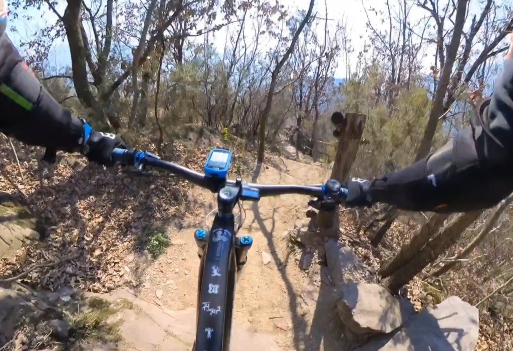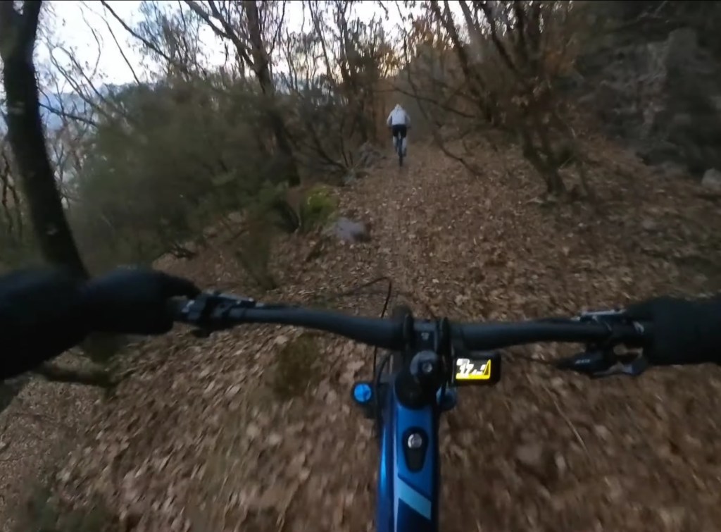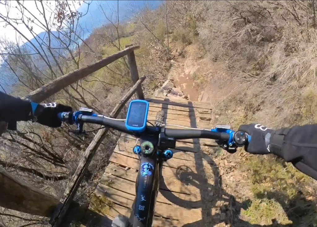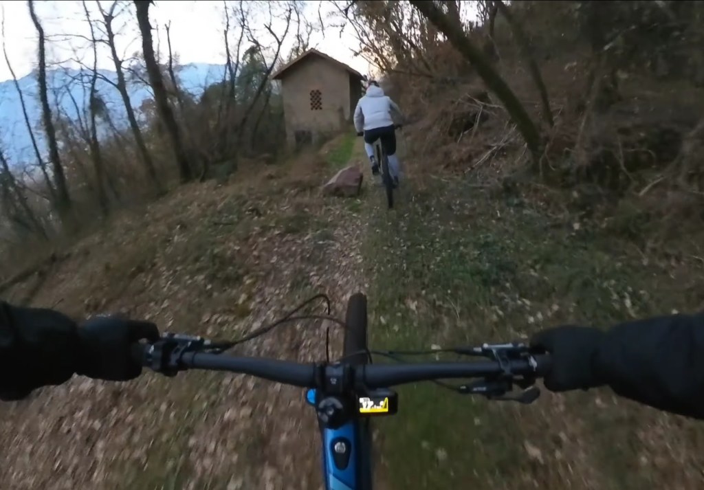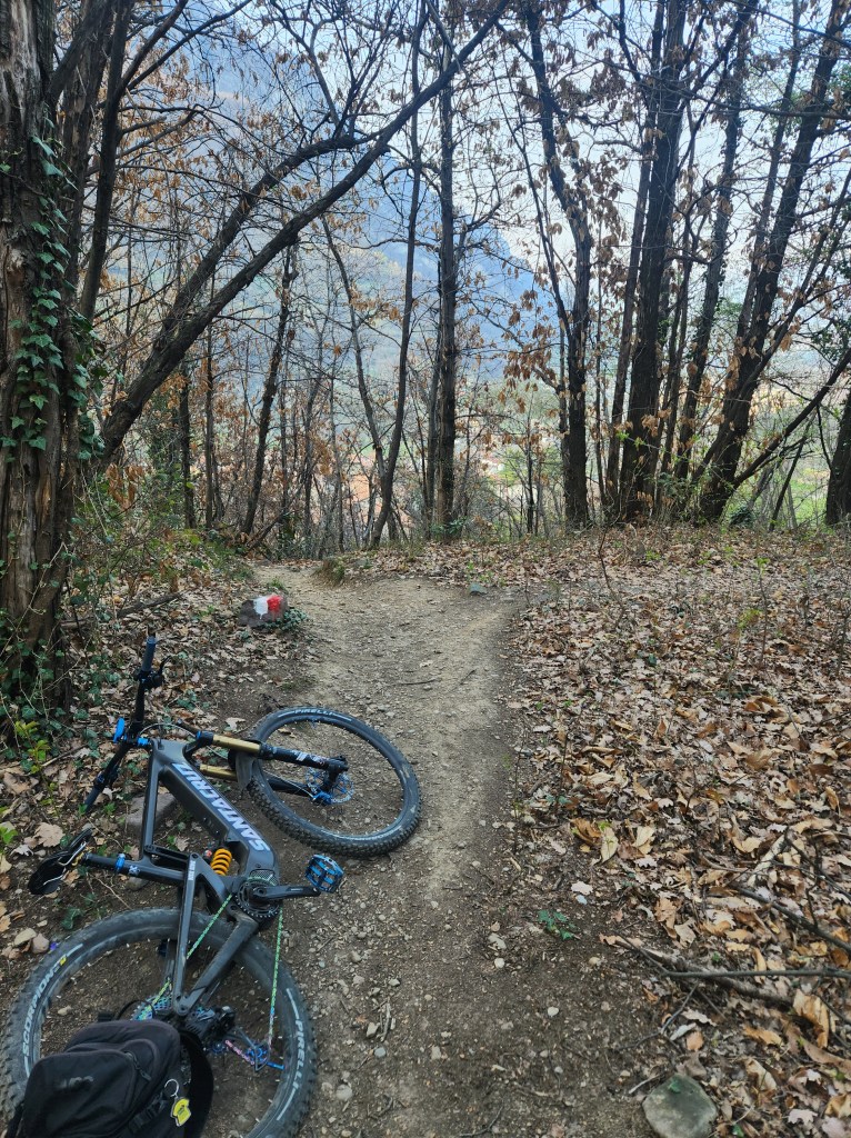 Qui seguiamo la traccia a terra . Subito a destra scenderemo subito nel sentiero classico di capo di lago . Ma dovremo calare le bici . Mentre a sinistra , scavalcheremo qualche ramo Ed un muretto (a breve puliremo il passaggio) , e ci congiungieremo con un sentiero , che più sotto , si ricollegherà anch’esso al sentiero classico di capo di lago , ma che sarà molto più divertente !