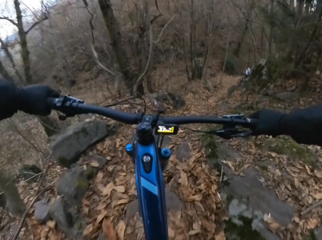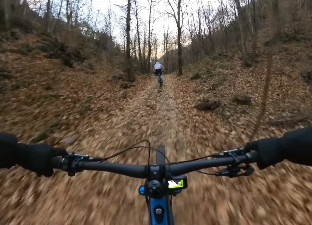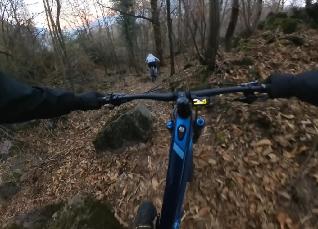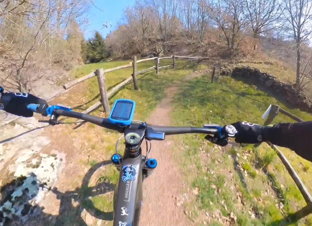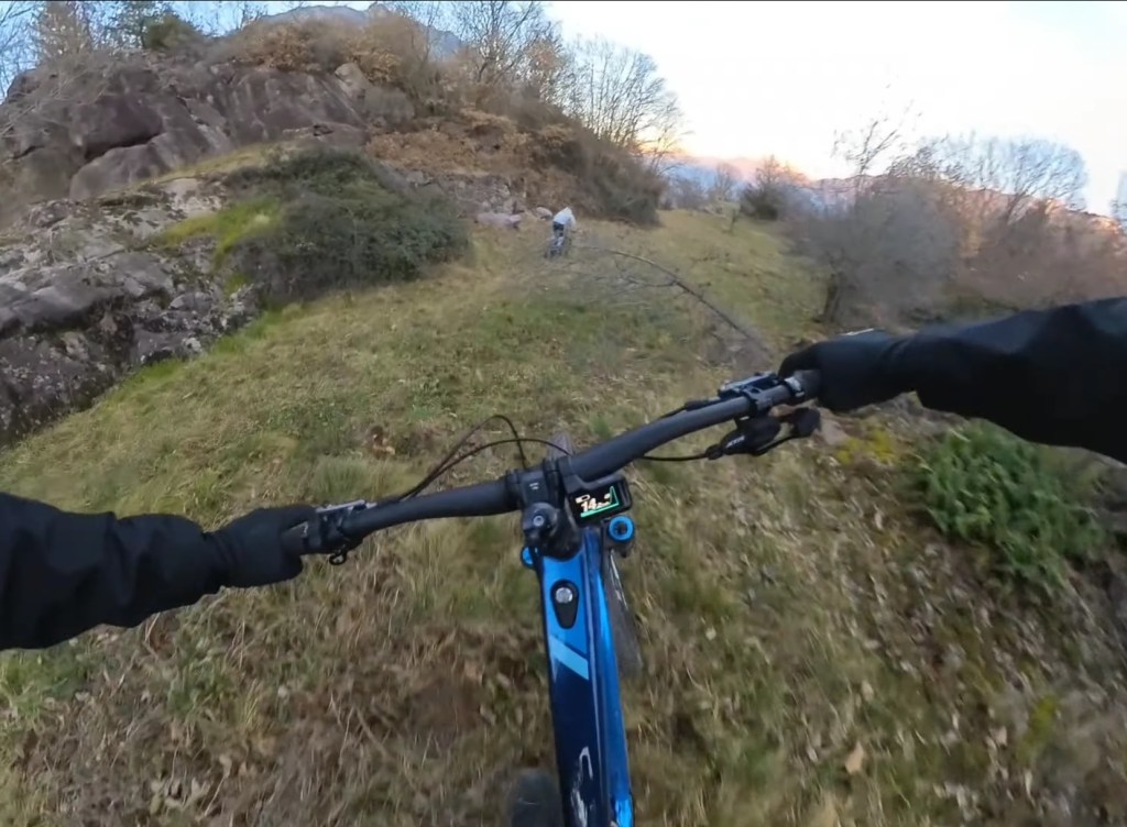 Giunti in fondo al prato , sulla destra comincerà la traccia , che potrete scorgere tra le foglie , essendo piuttosto marcata . Dopo il primo tratto a spinta , per aggirare un masso , avrete via libera per dare sfogo al divertimento !!!